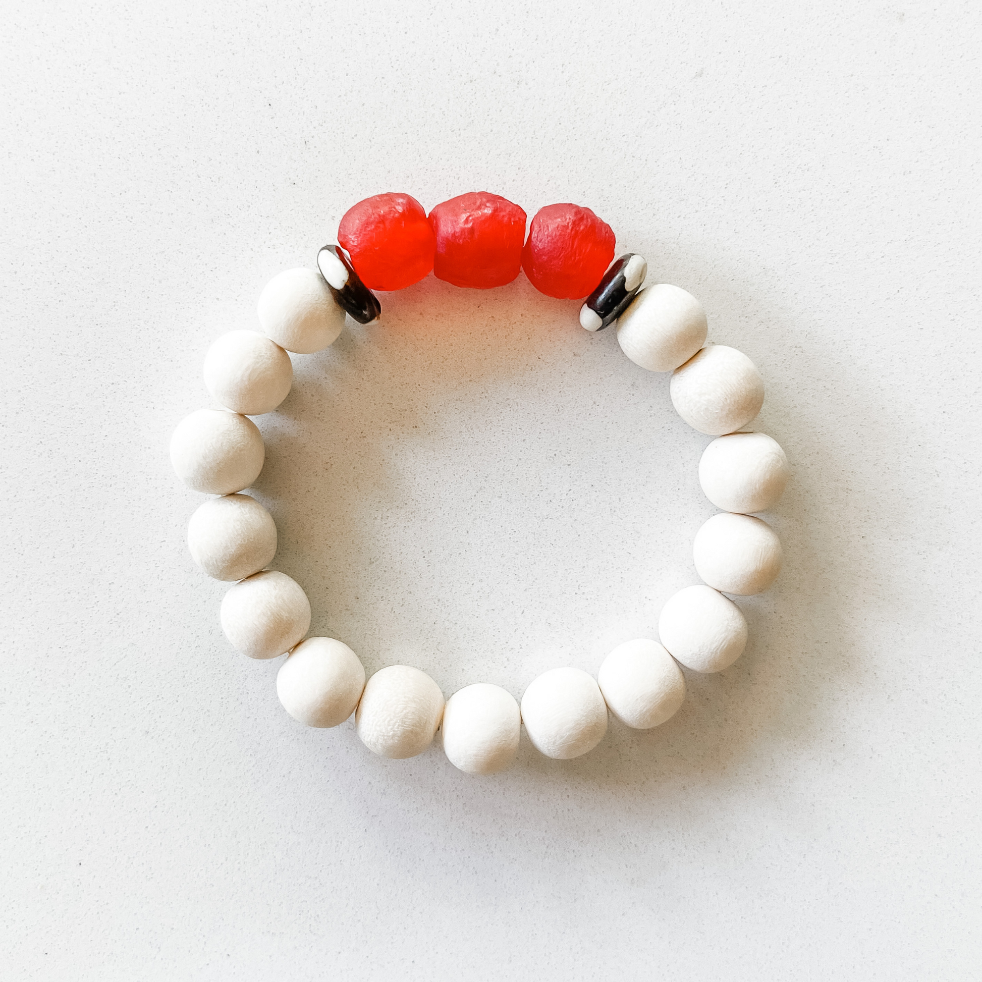 Packed with red, white and accents of black this Arkansas Razorbacks Game Day Super Stack is sure to scream Woo Pig Sooie!! A mix of natural wooden, recycled glass, and carved bone beads this stack of 5 bracelets is going to add some serious style to your game day ensemble!