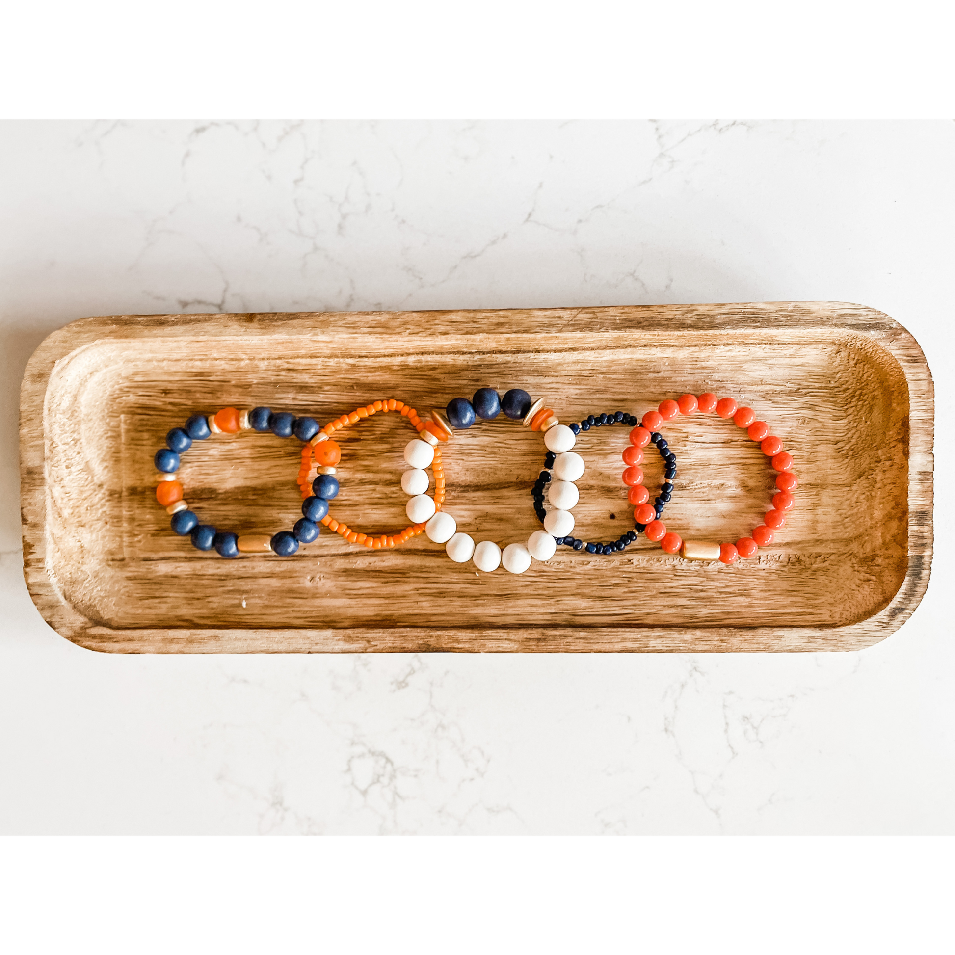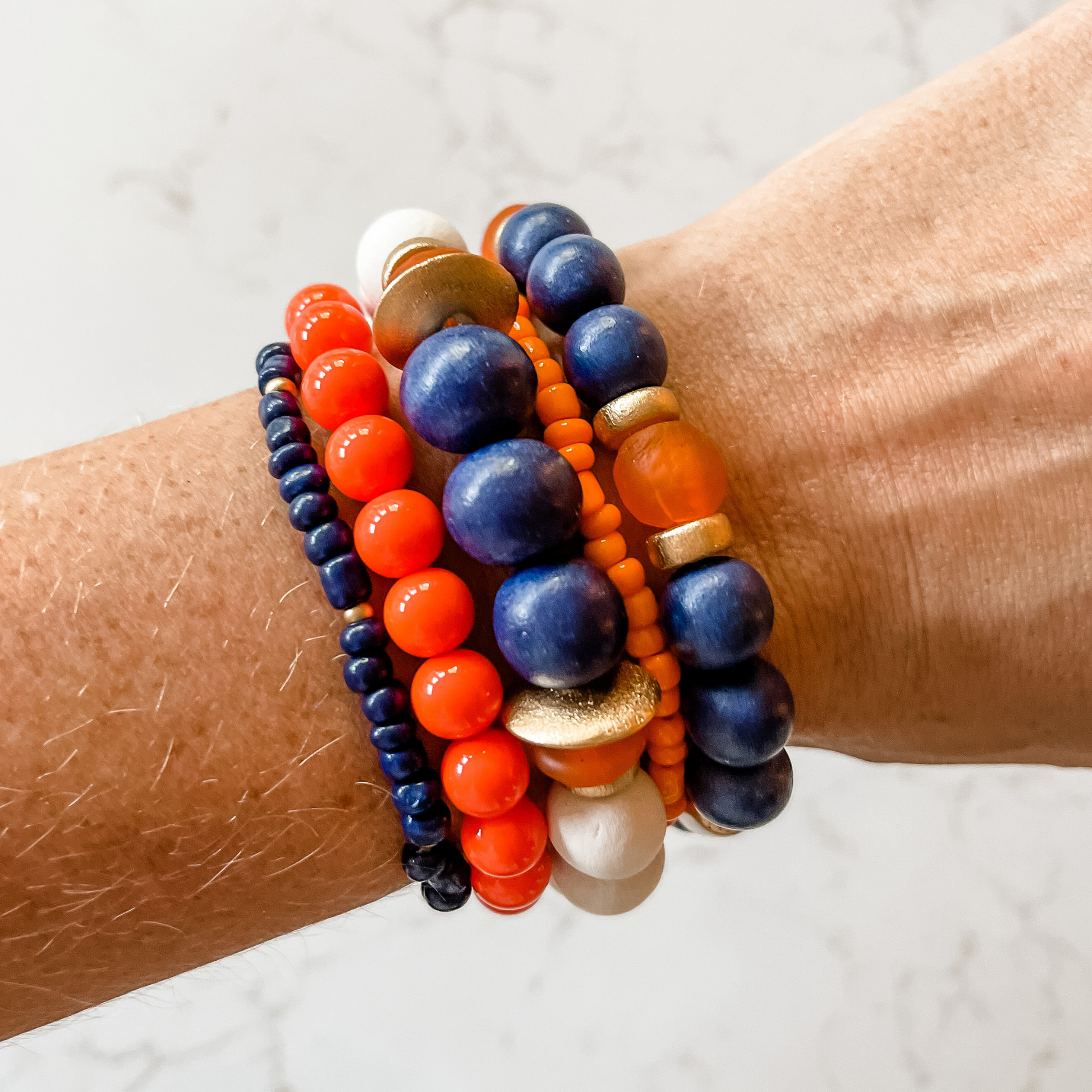 Full of orange, navy and white, this Auburn and UVA Super Stack is a fun mix of colors, textures and sizes. This stack of 5 bracelets is sure to add some serious Game Day style to your wardrobe! Go War Eagle and Cavaliers!