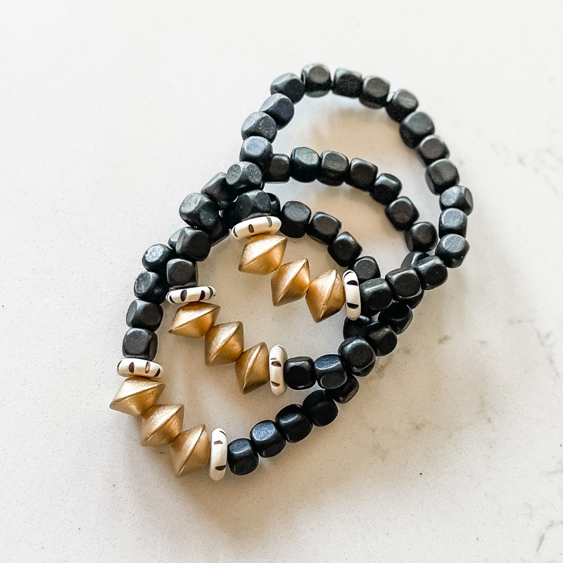 The Wood + Bone collection is a blend of natural wooden beads, carved bone and golden accents. This black wooden cube beads and gold bicone bracelet with carved mala bone is the perfect neutral statement bracelet!