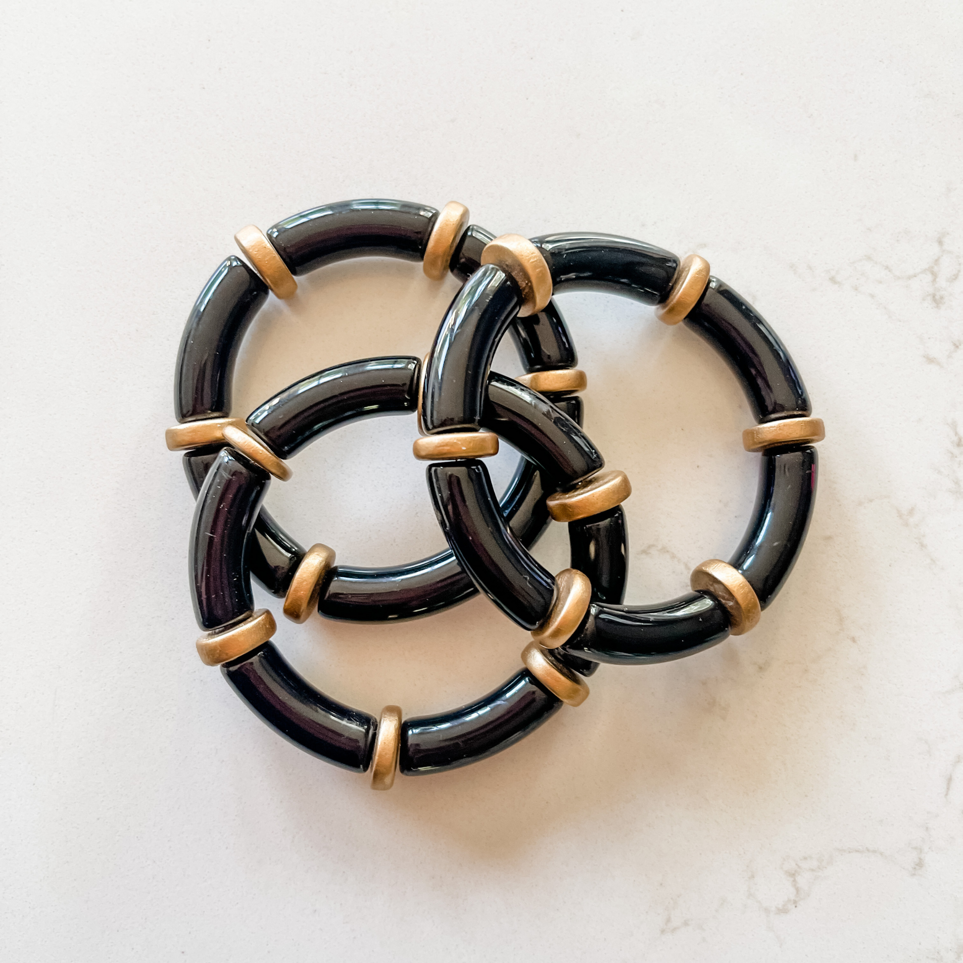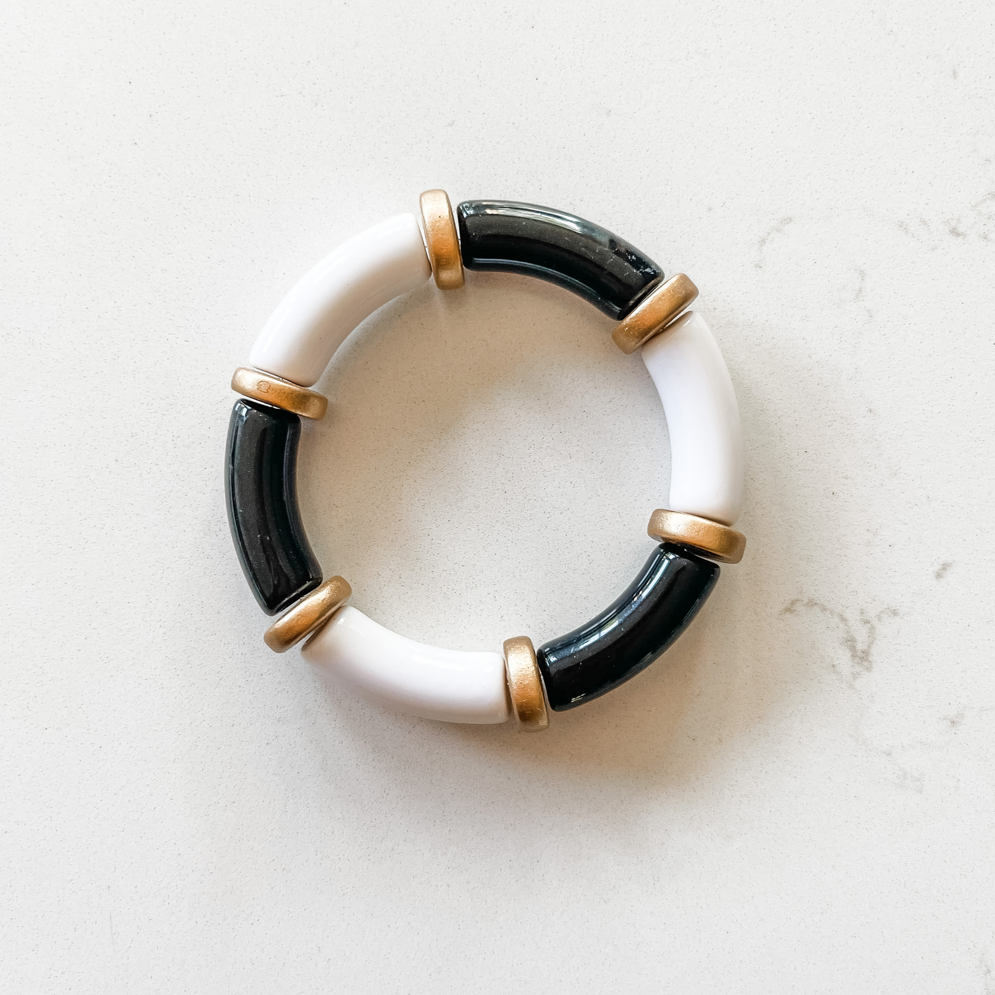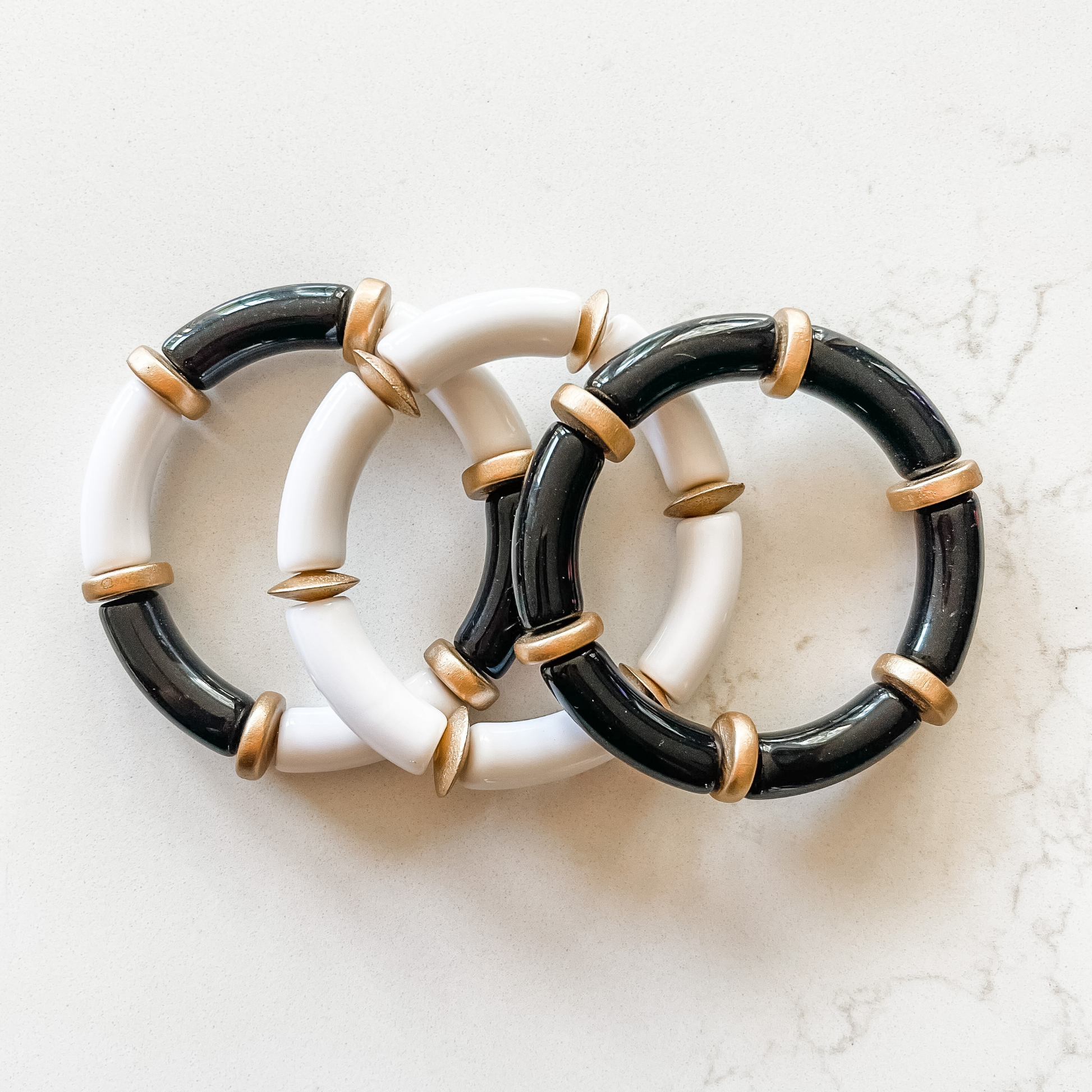 The Black + White chunky acrylics are a classic collection of black, white and gold acrylic tube bracelets. These chunky acrylic bangles are the perfect way to keep it neutral or dress up any outfit!