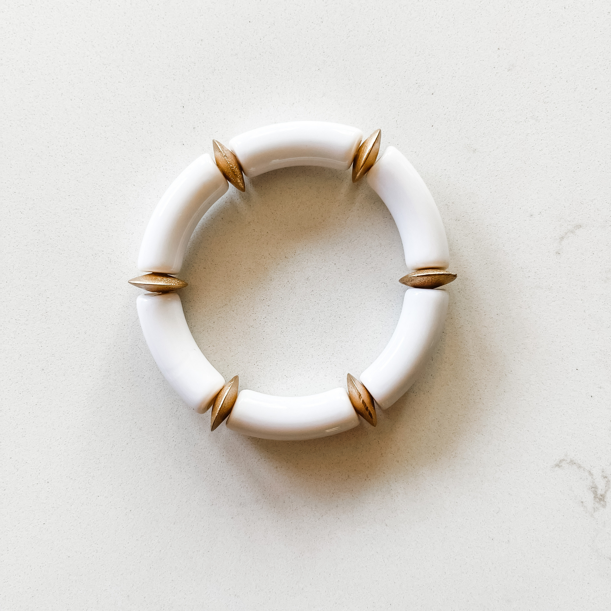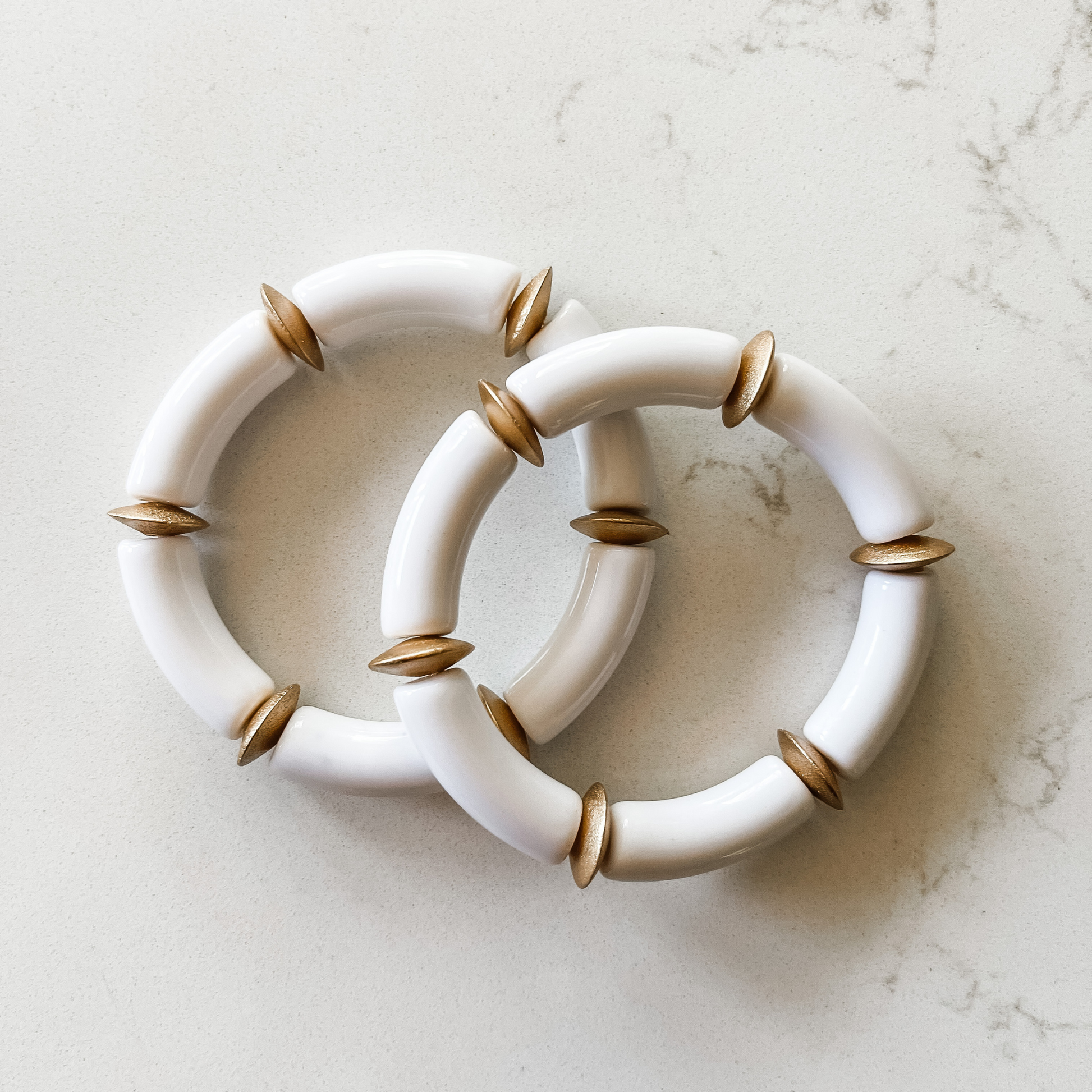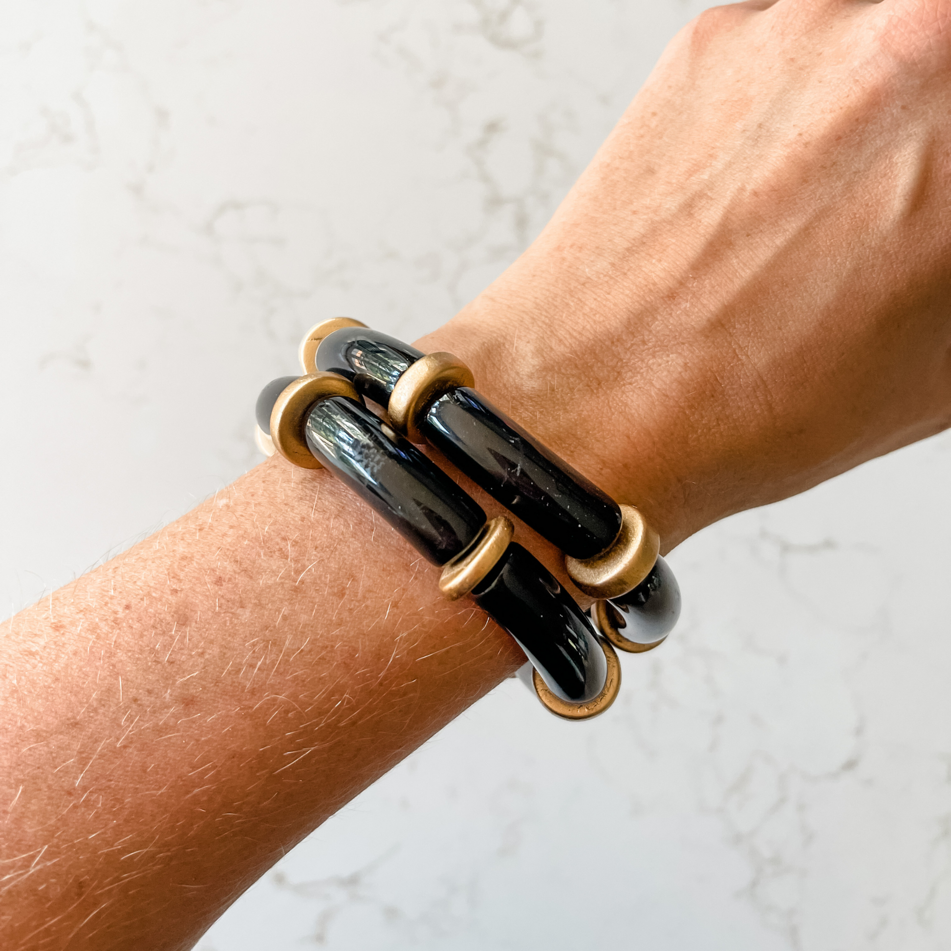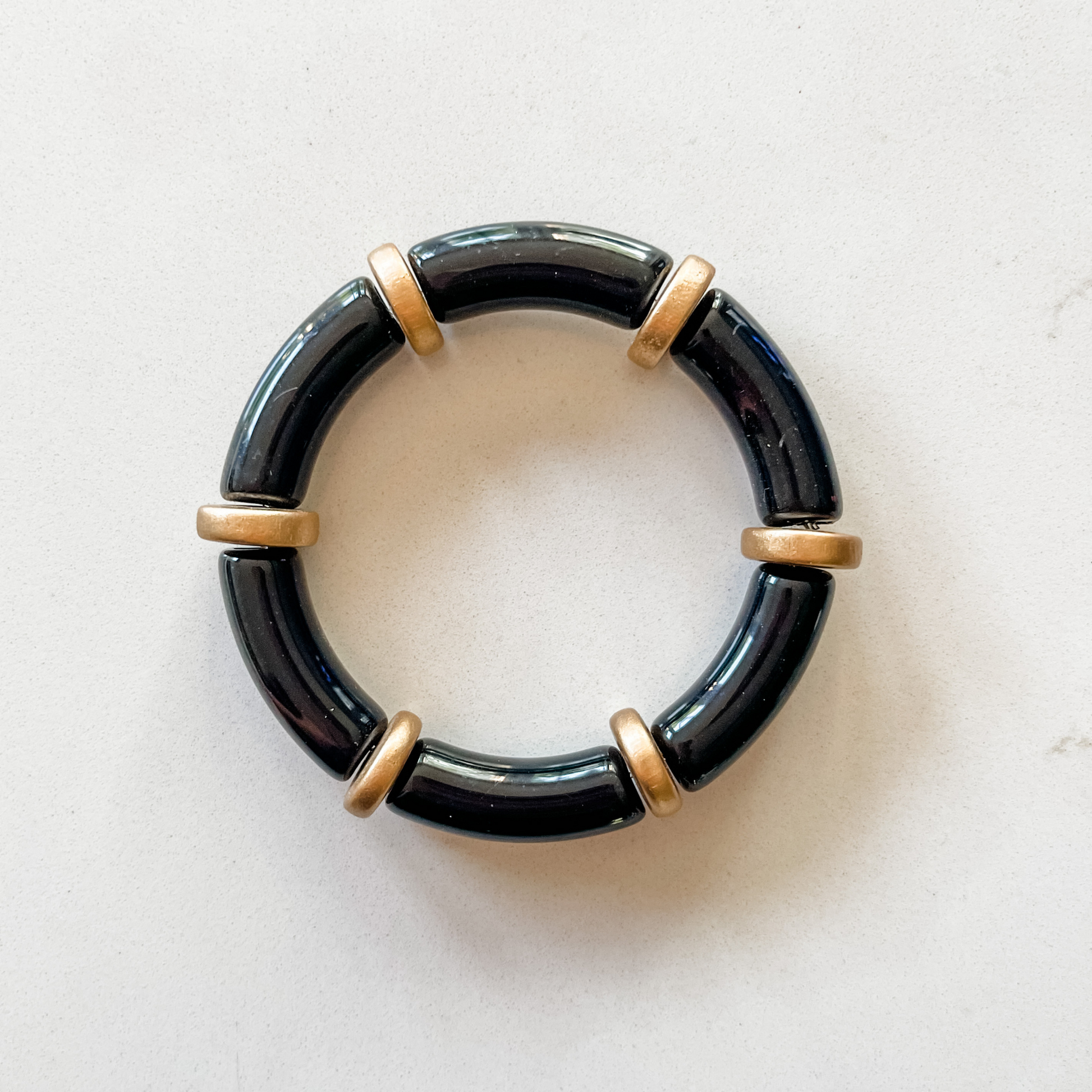 The Black + White chunky acrylics are a classic collection of black, white and gold acrylic tube bracelets. These chunky acrylic bangles are the perfect way to keep it neutral or dress up any outfit!