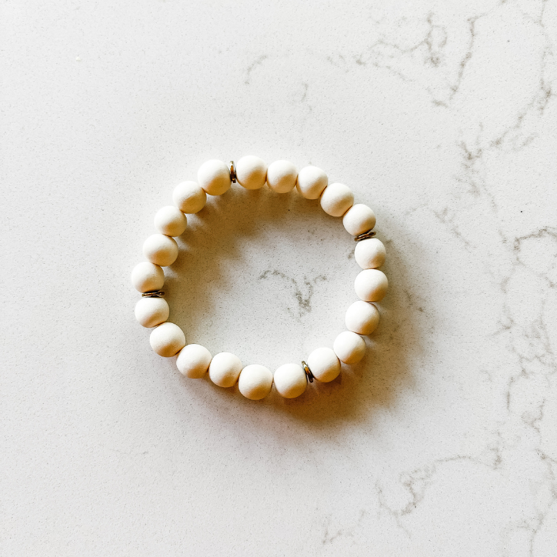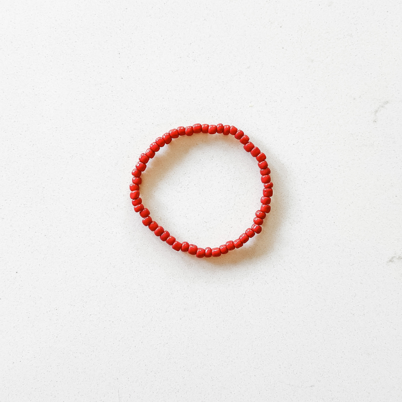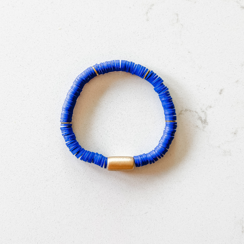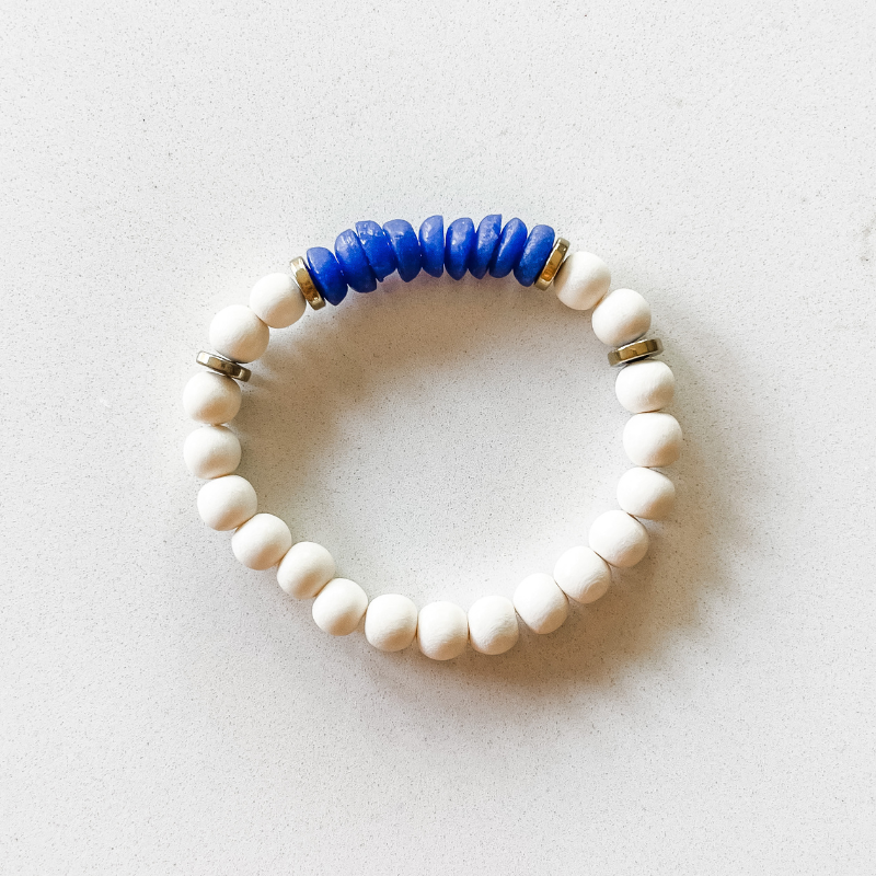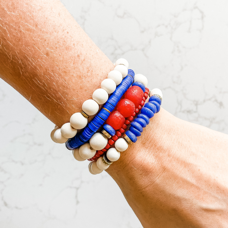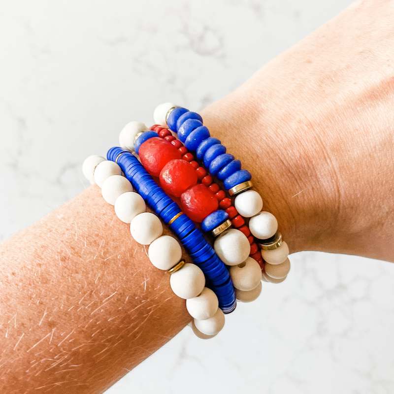 Packed with red, white and blue this Buffalo Bills five stack of natural wood, heishi, bone disks, and recycled glass beads is a fun mix of shapes, textures and sizes to give your wrist the perfect way to say Go Bills!