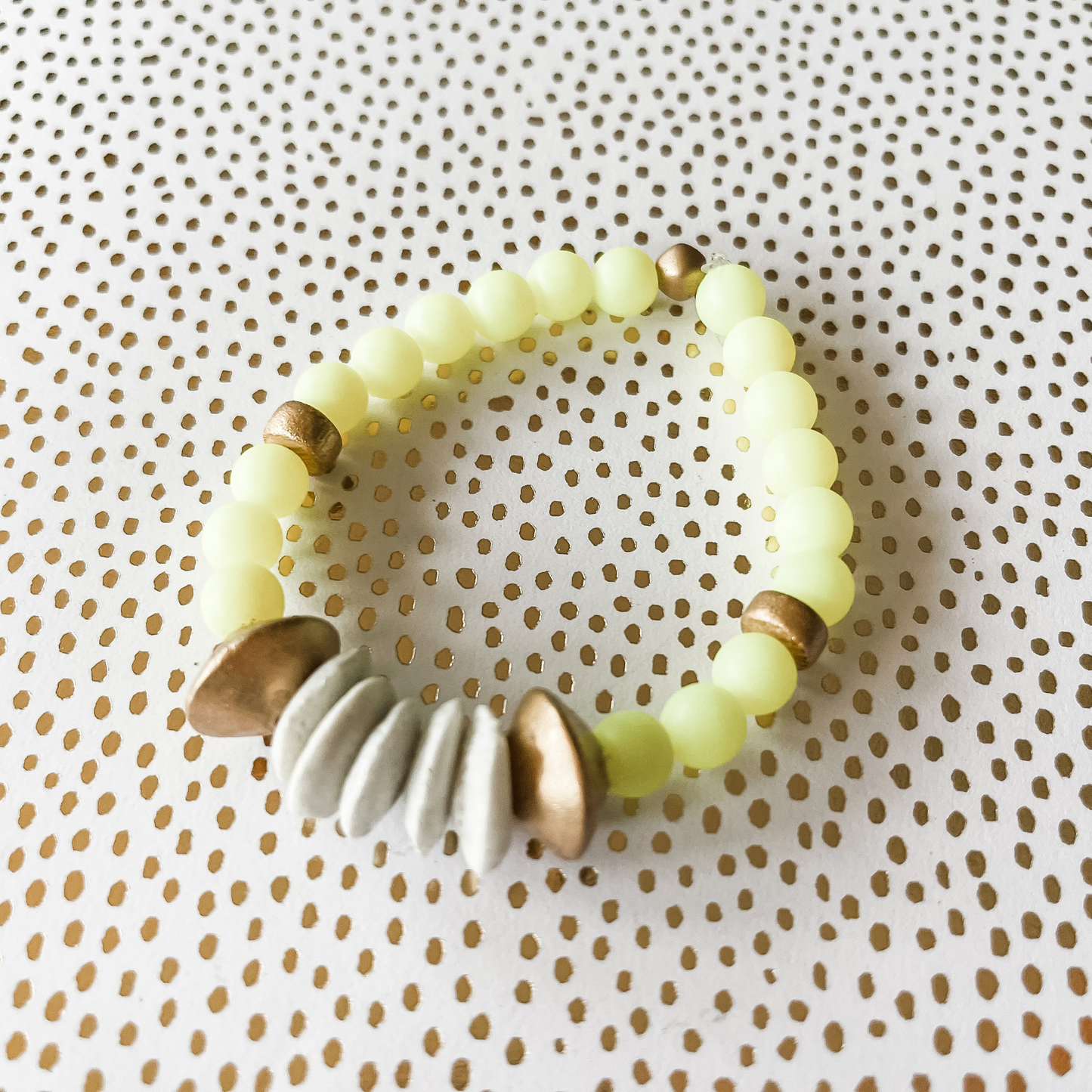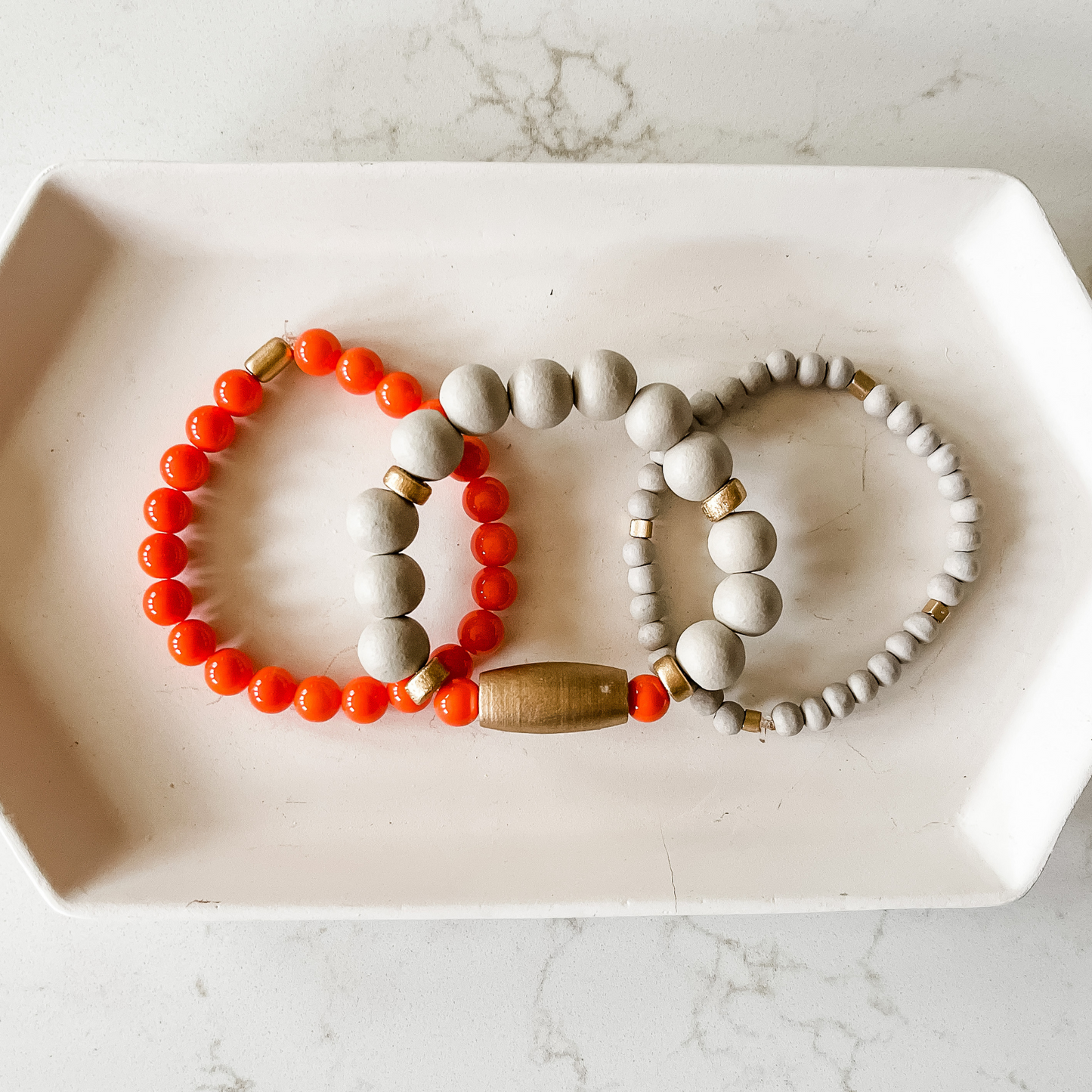 The Cabo is a standout stack with its vibrant chartreuse, bright orange and beautiful turquoise balanced with white, gold and warm greige!
