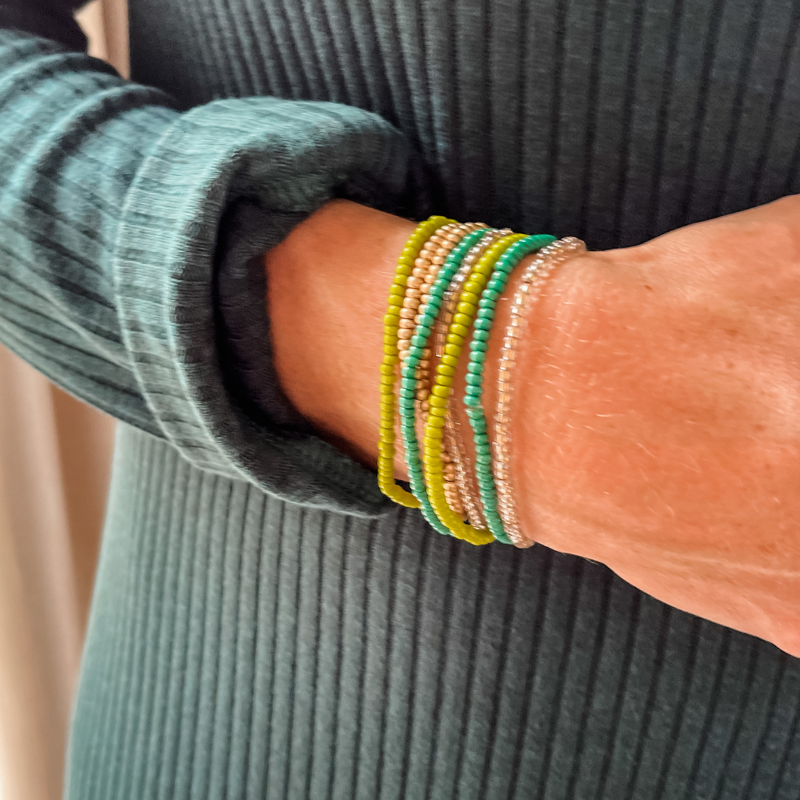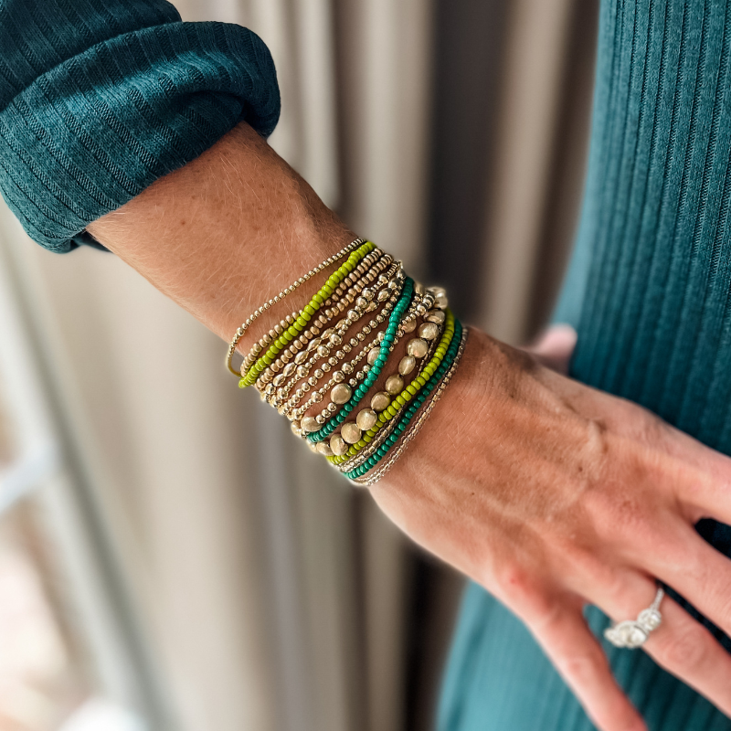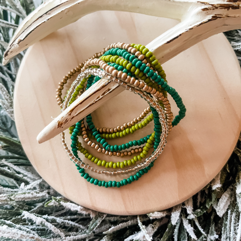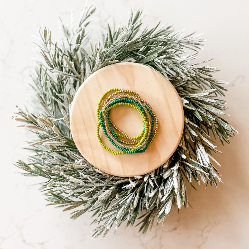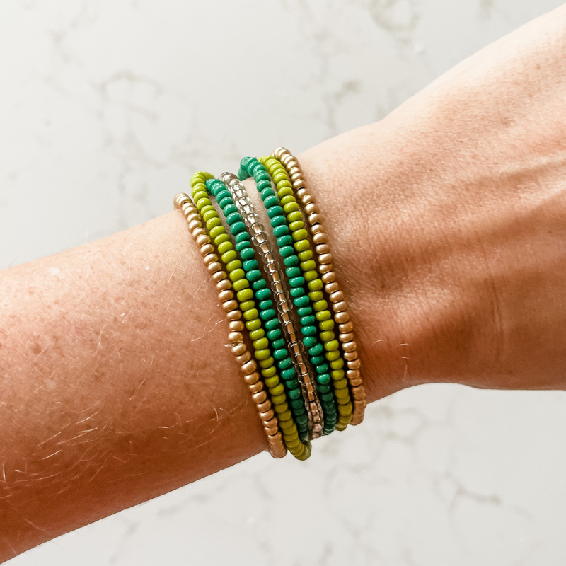 This classic seed stack is a beautiful blend of various shades of green and gold. This stack of 7 is the perfect way to add some color to your wrist this holiday season. Wear them all together or add in some of your favorite gold bracelets for an even more festive touch!