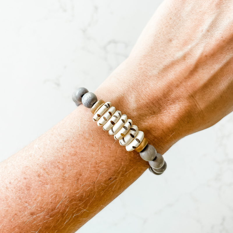 The Wood + Bone collection is a blend of natural wooden beads, carved bone and golden accents. This grey and carved mala bone is the perfect neutral statement bracelet to spice up any outfit!