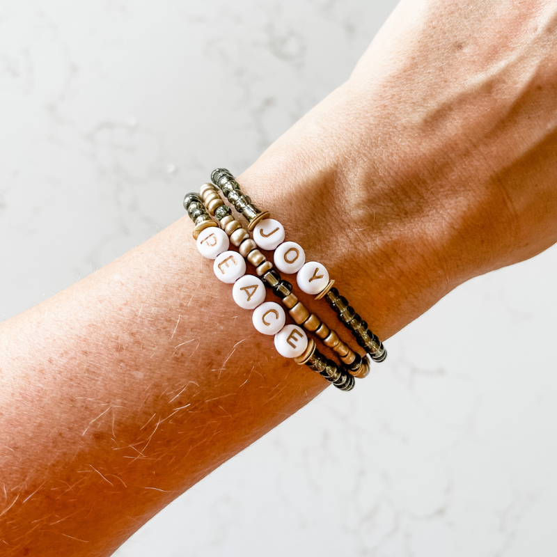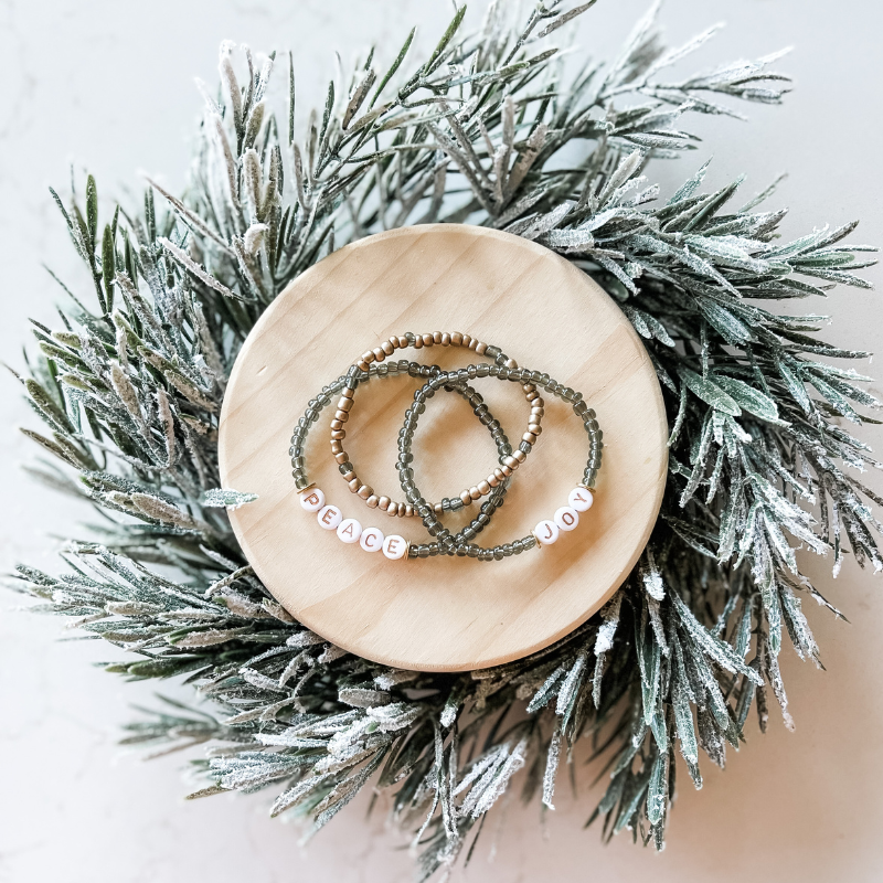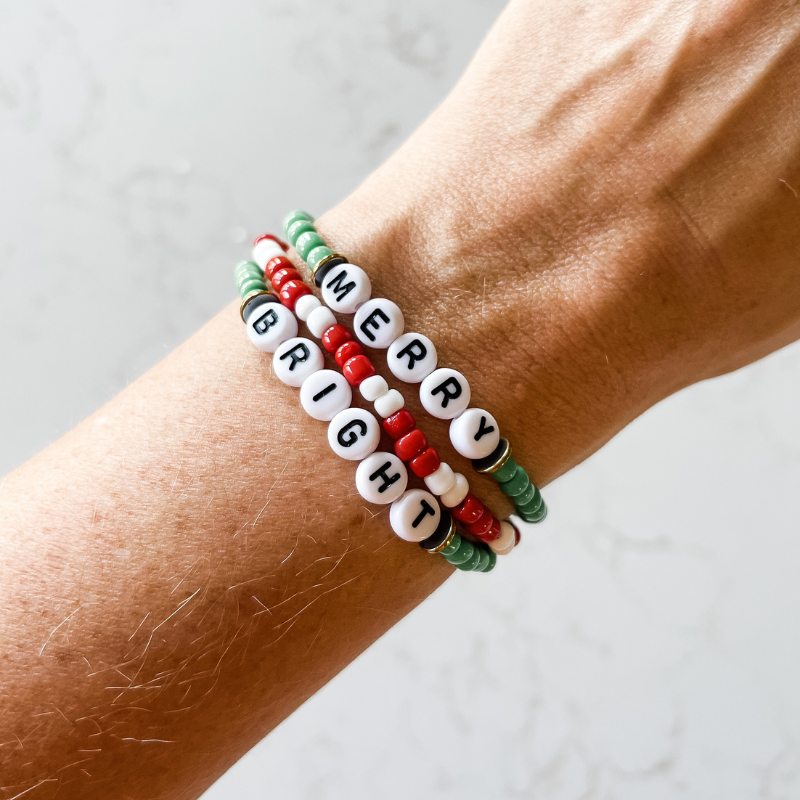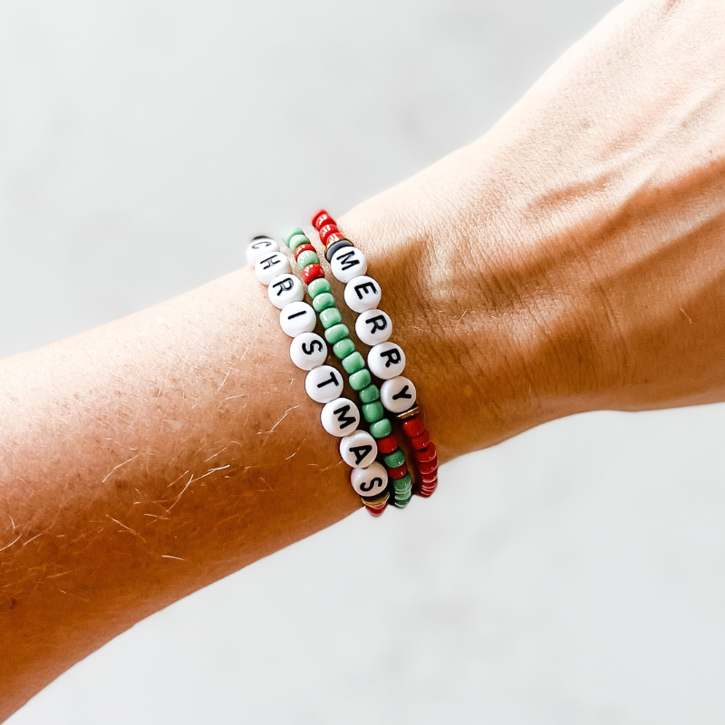 Available in three different colors with three different sayings - misty grey/gold, green, or red, this set of three glass seed/word bracelets is a simple but classic way to add something festive to your holiday ensemble!