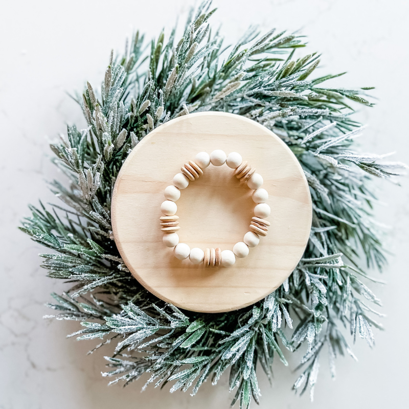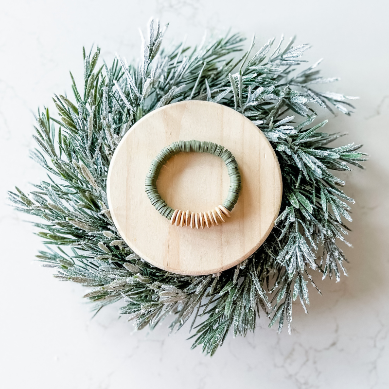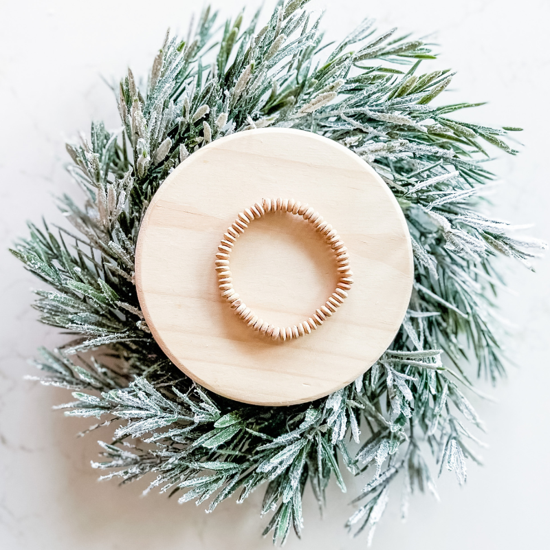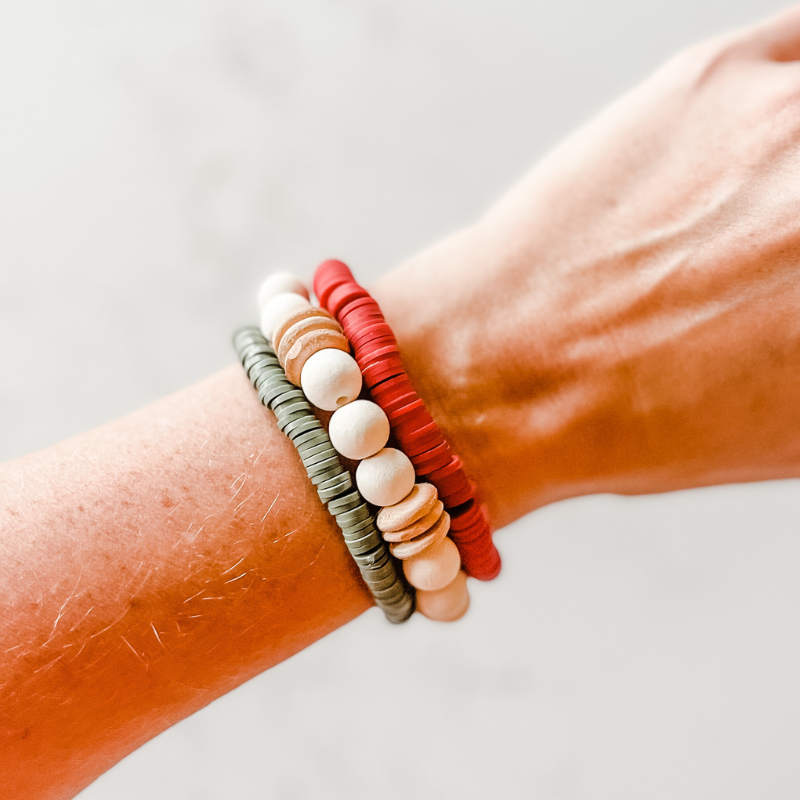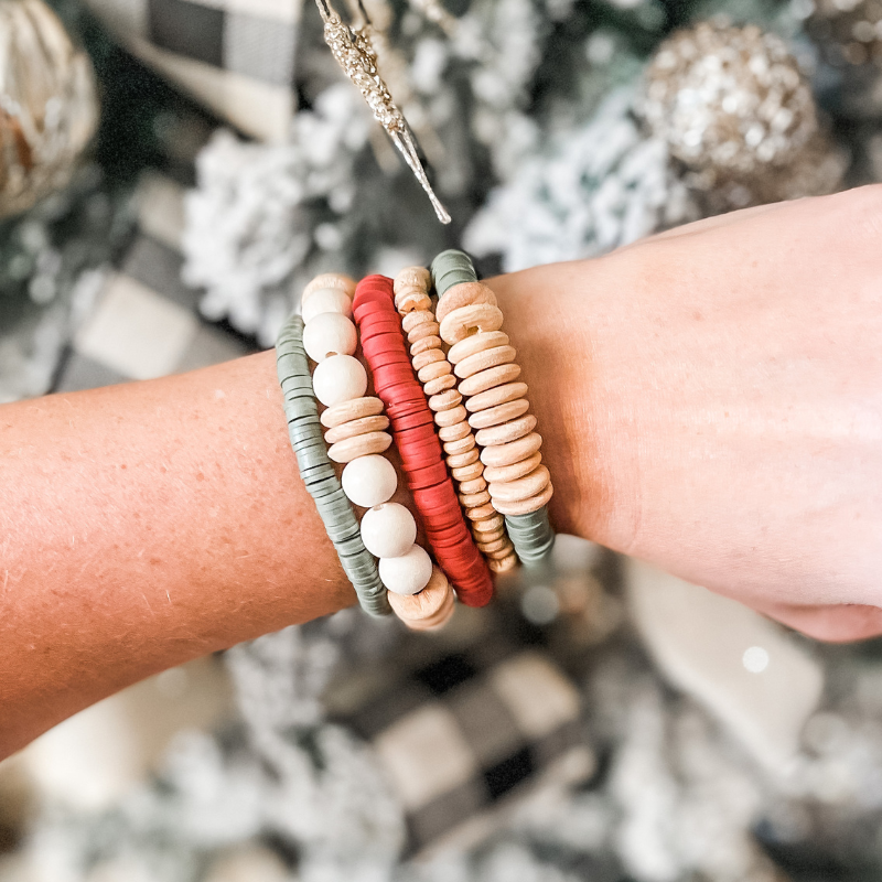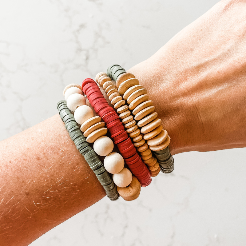 If you are looking for a traditional but neutral stack that spreads holiday cheer then look no further than the Merry Berry Mistletoe stack! Full of neutral cream tones, brick red and moss green heishi beads and wooden disks this stack is the perfect balance of holiday colors that can be worn all together or split up for any time of year to accent your wardrobe!