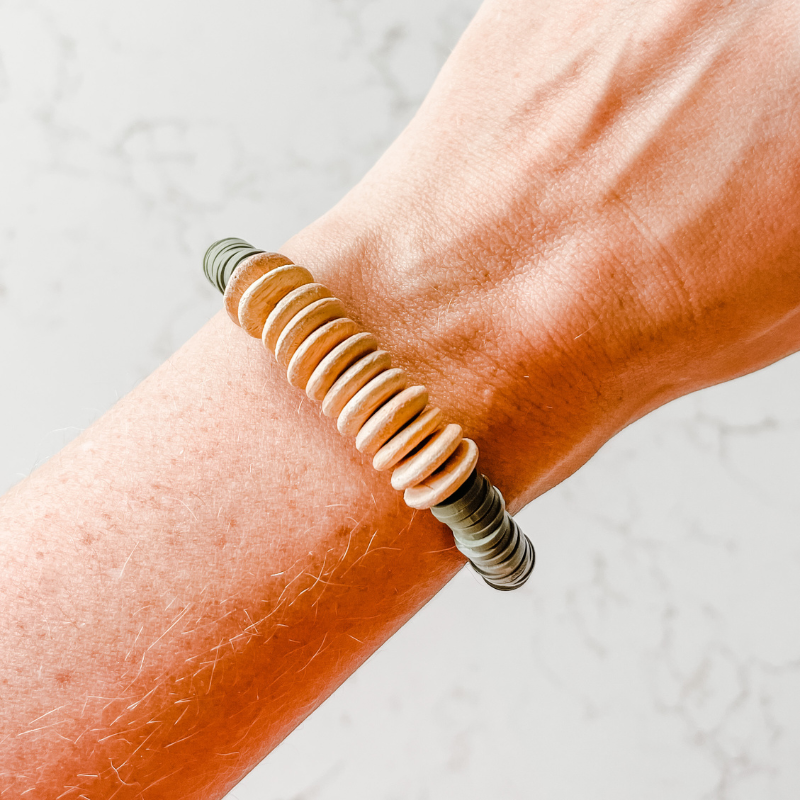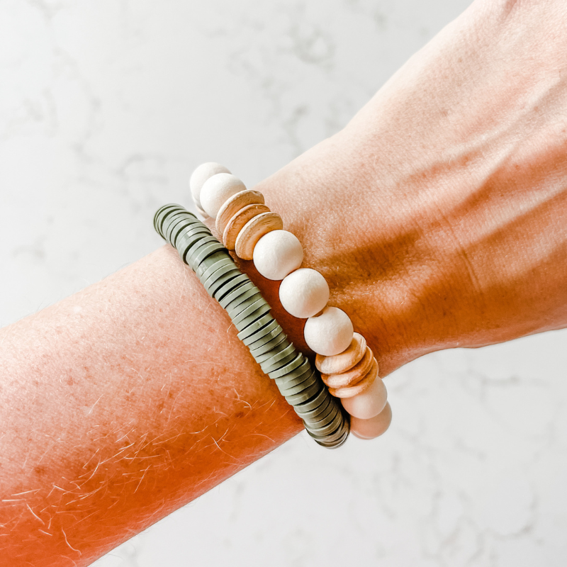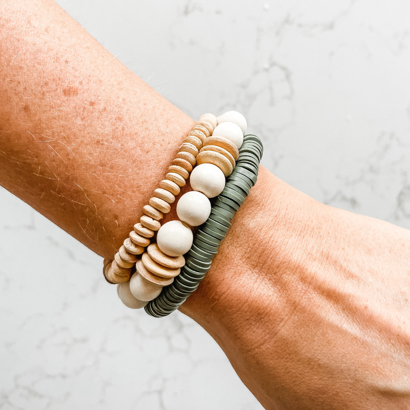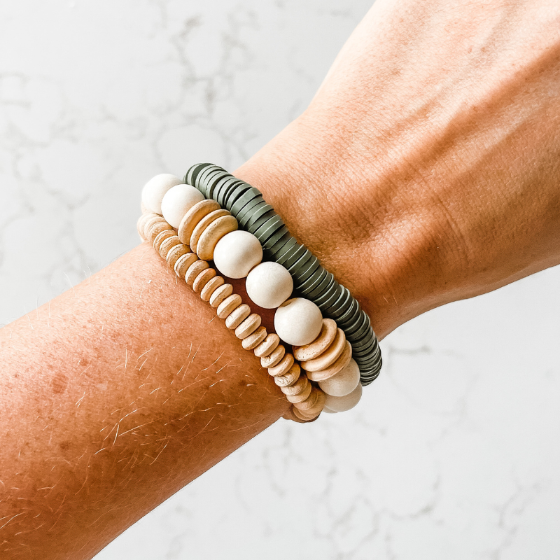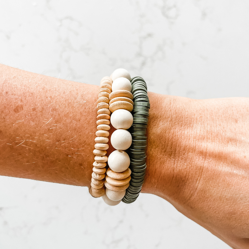 If you are looking for a traditional but neutral stack that spreads holiday cheer then look no further than the Merry Mistletoe Mini stack! Full of neutral cream tones, mossy green heishi beads and wooden disks this stack is the perfect balance of holiday colors that can be worn any time of year to accent your wardrobe!