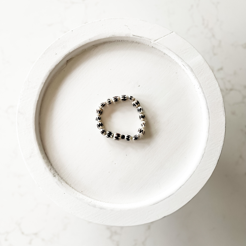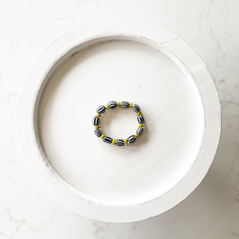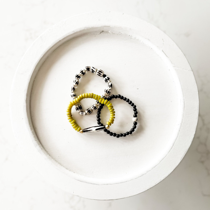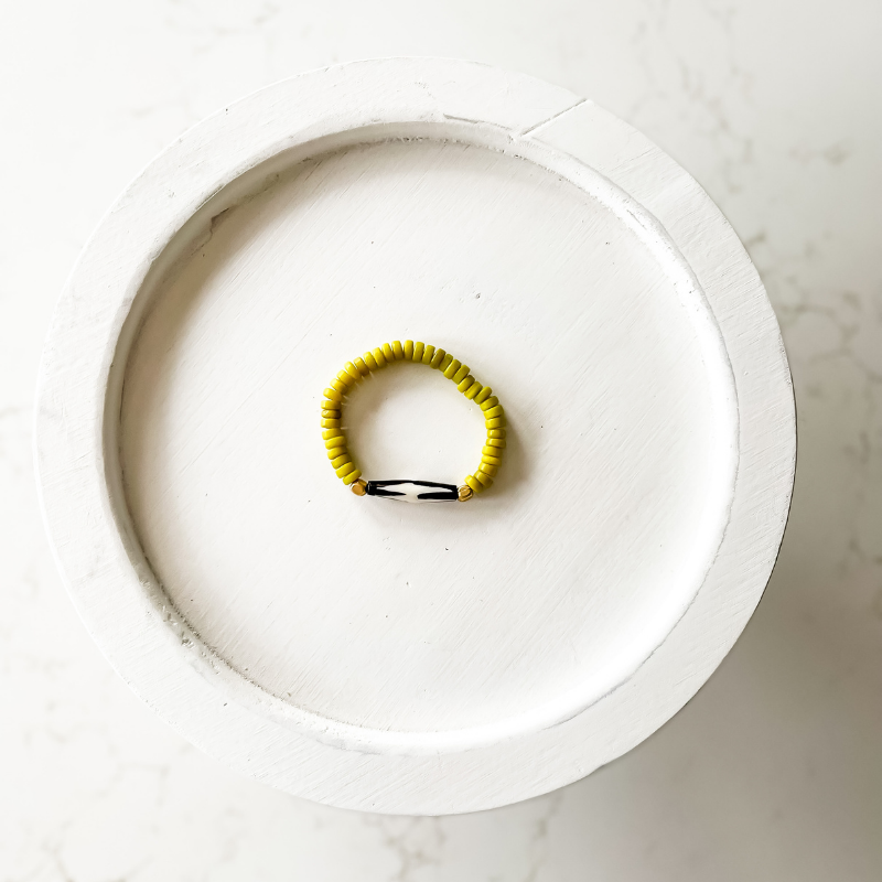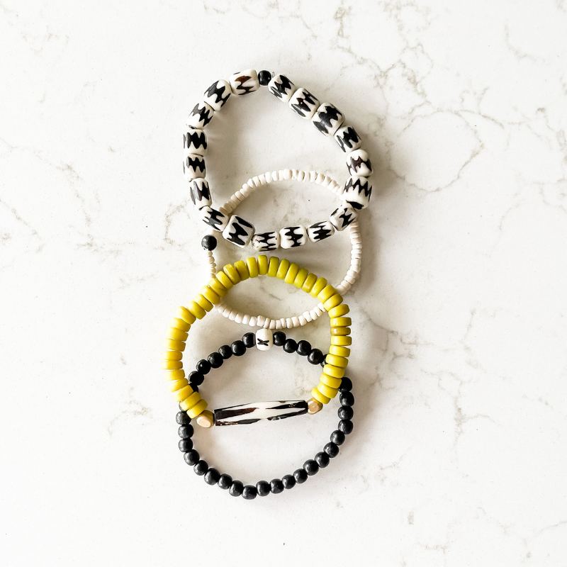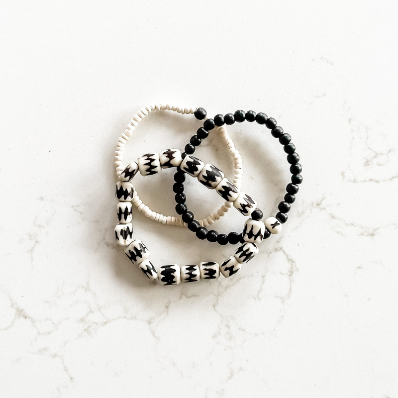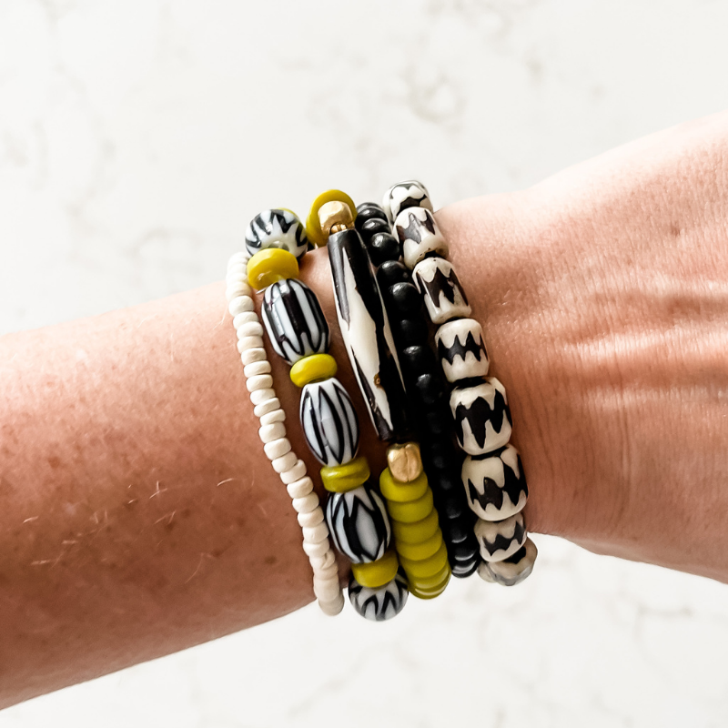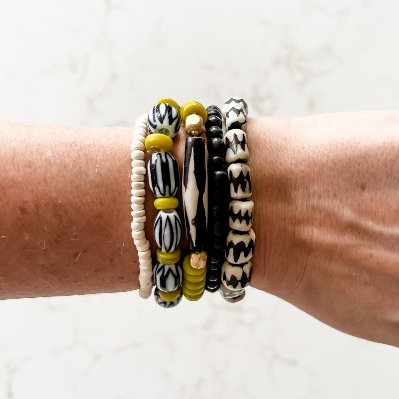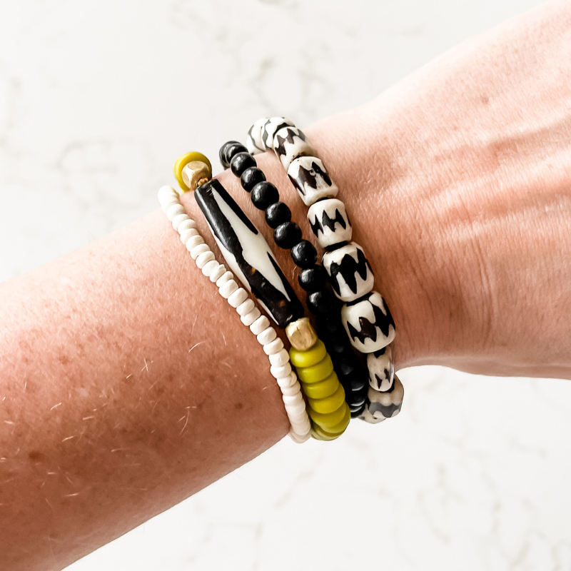 The Monteverde stack is the pop of color your vacation wardrobe needs! Full of fun patterns, textures, and sizes this stack of five is anything but boring! Each individual bracelet brings something unique to the table. Lime green bone button beads, tiny white coconut disks, natural black wooden beads, carved chevron bone beads, and watermelon glass beads help to create a stack that brings an instant fiesta to whatever outfit you're wearing!