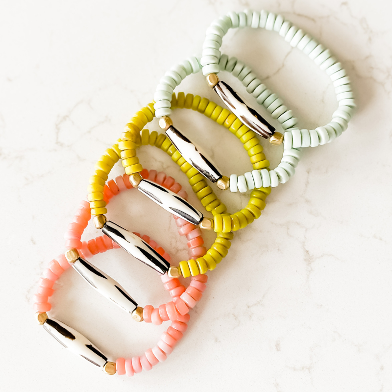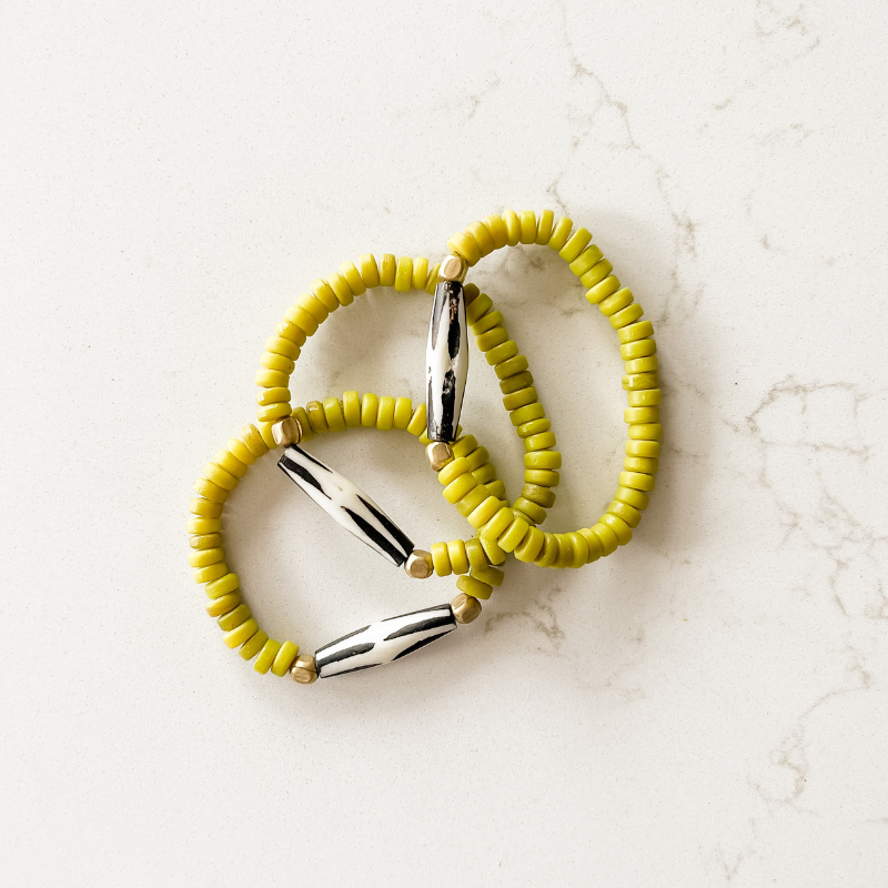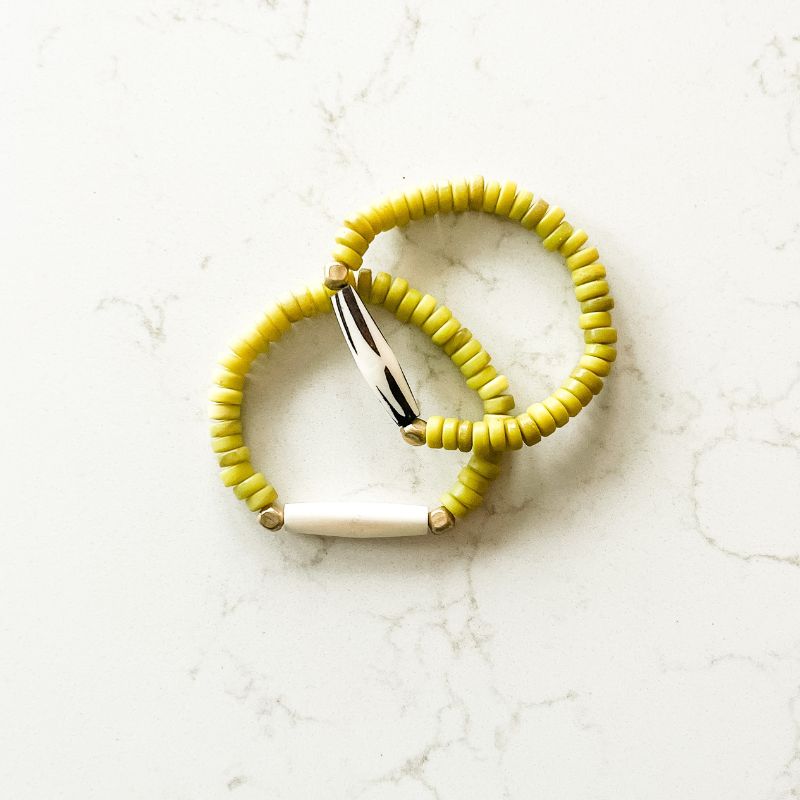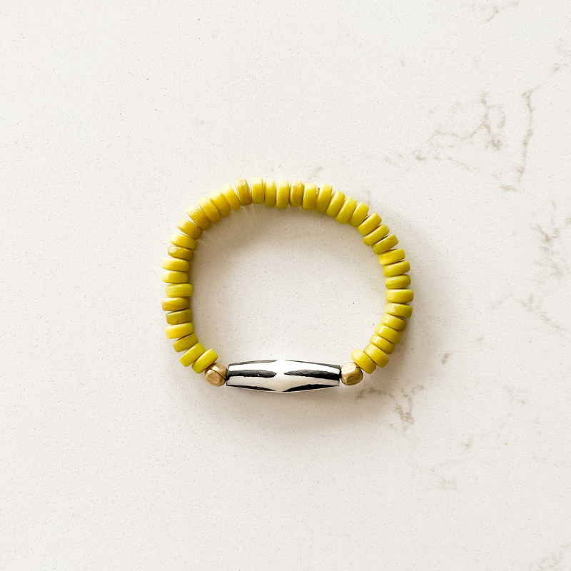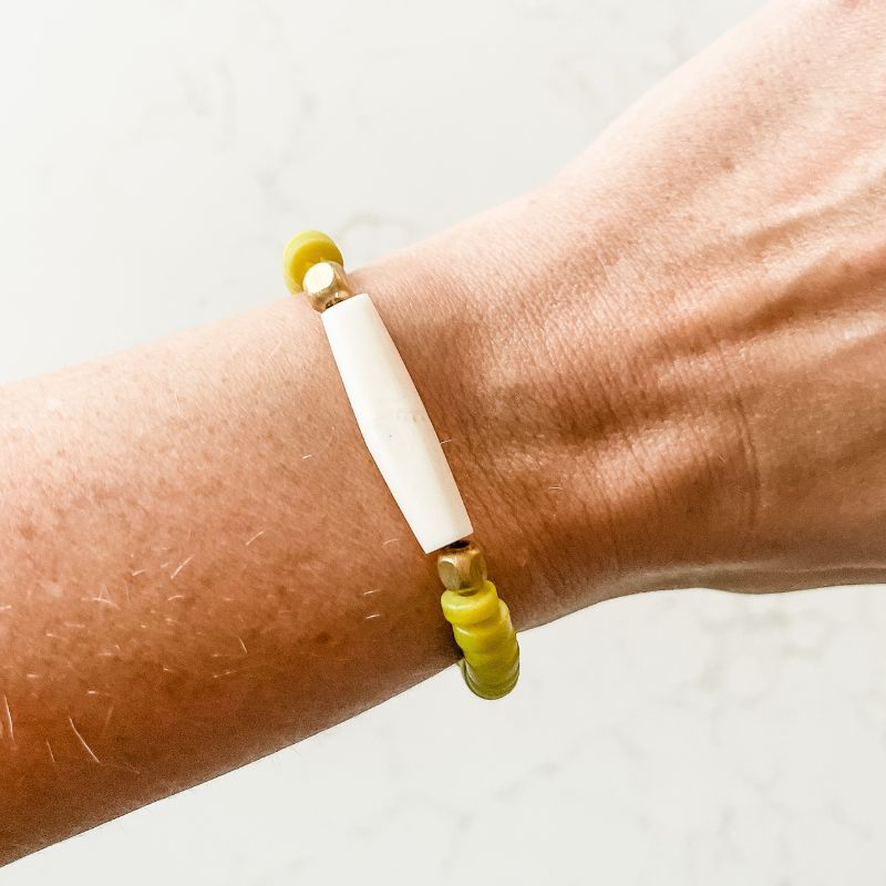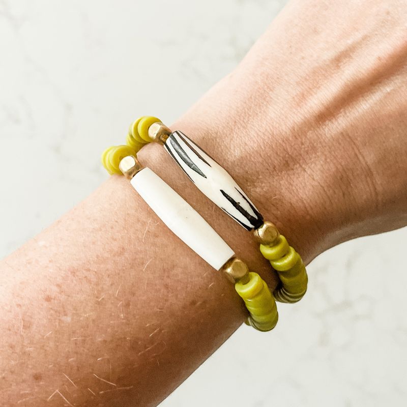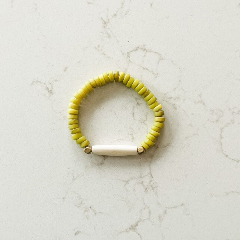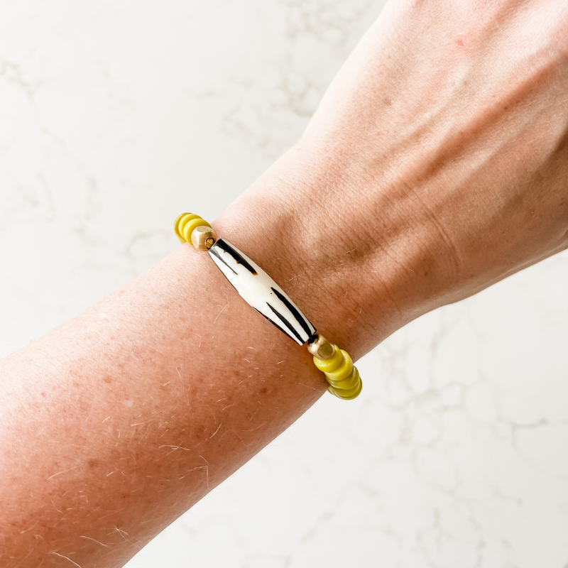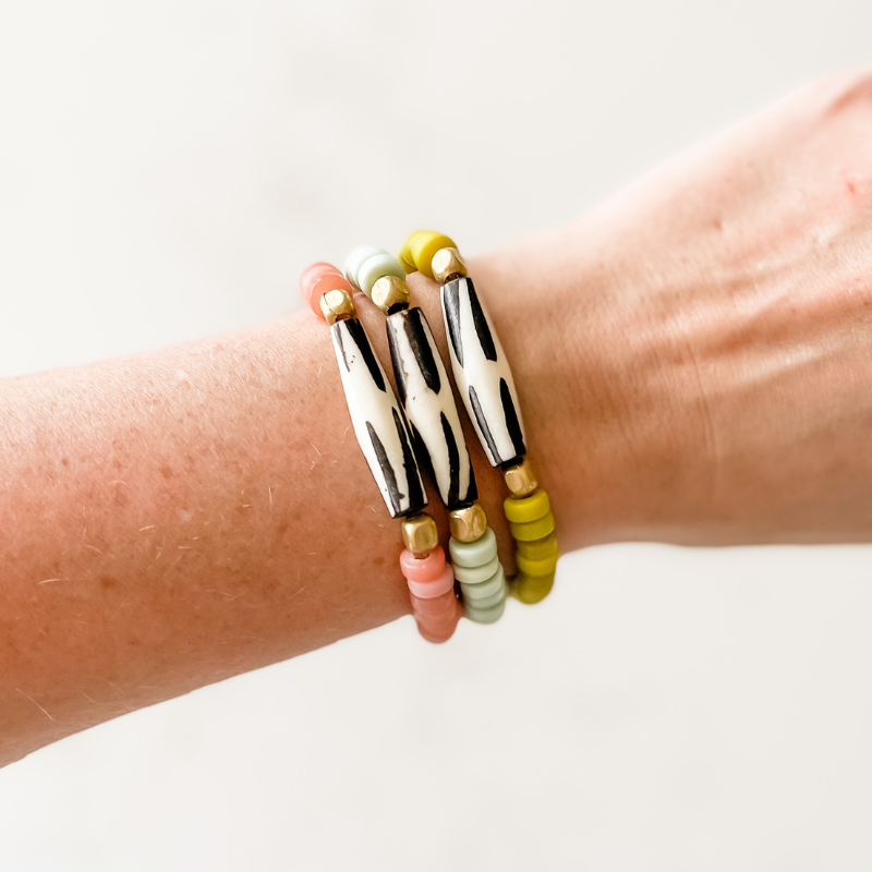 The Paletas bracelet is available in three different colors (mint, watermelon, and lime) and is compiled of handcrafted glass button beads from the island of Java and elongated bone batik beads from Africa with antique brass accents. These bright and stylish bracelets are simple ways to add pops of color and style to your everyday wardrobe!