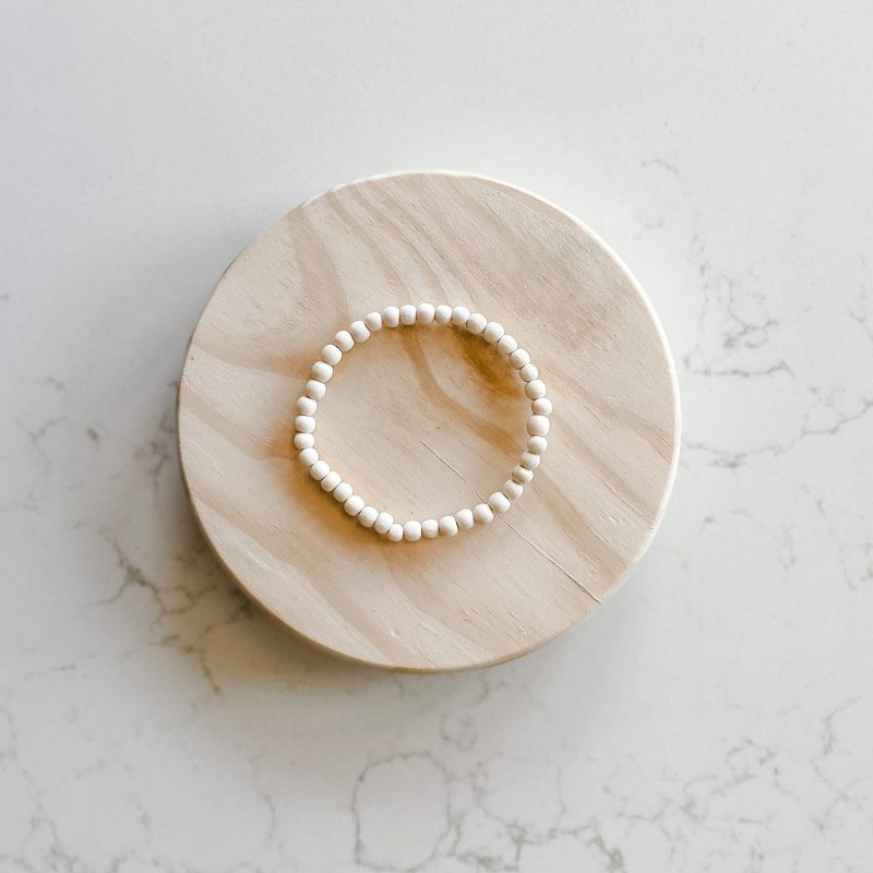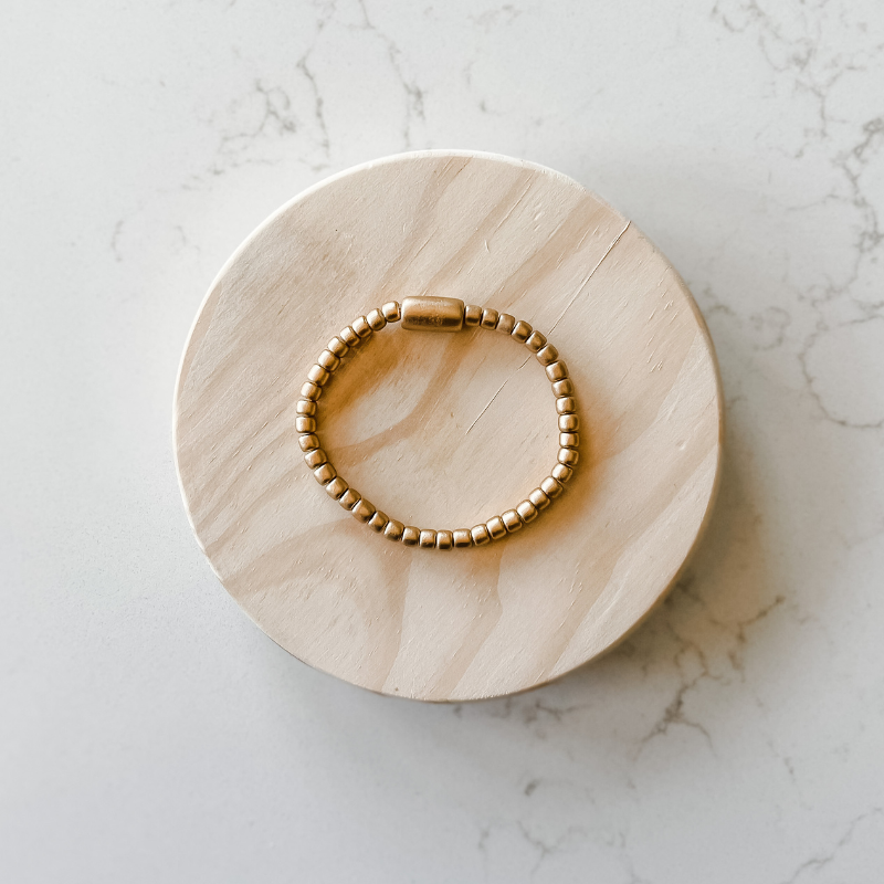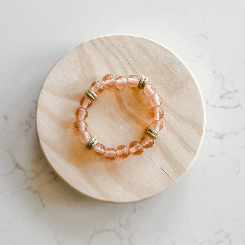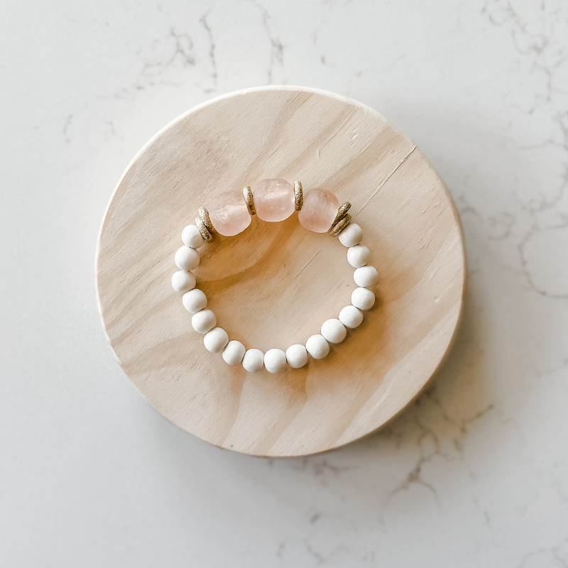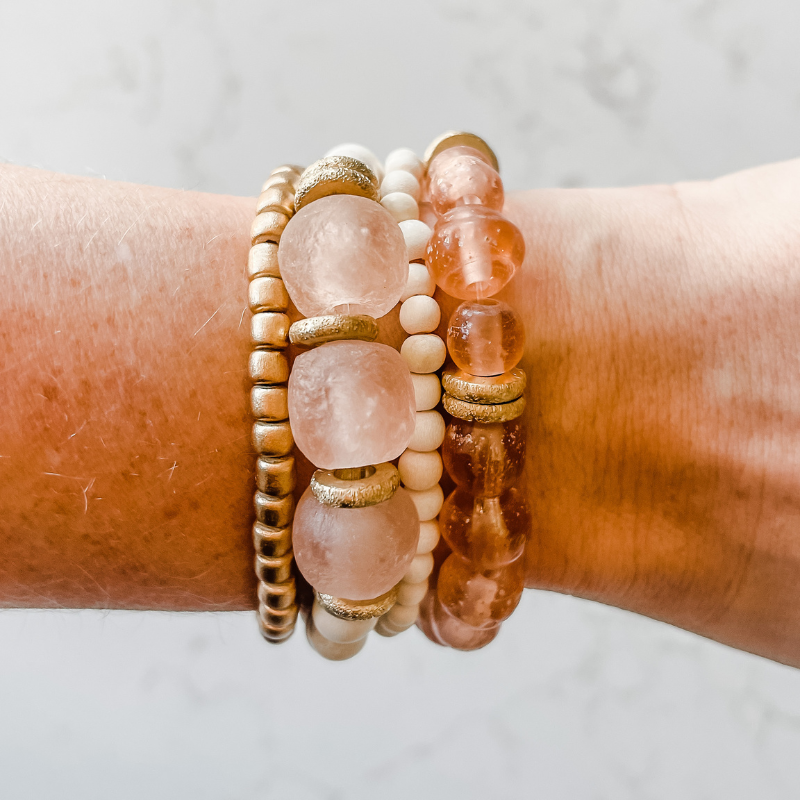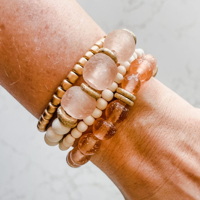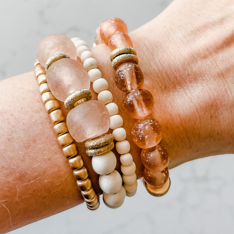 This feminine and flirty stack of four is full of various shades of recycled pink glass, golden accents and white natural wooden beads. Pair it with your favorite sundress and take your wrist on a tranquil vacation!