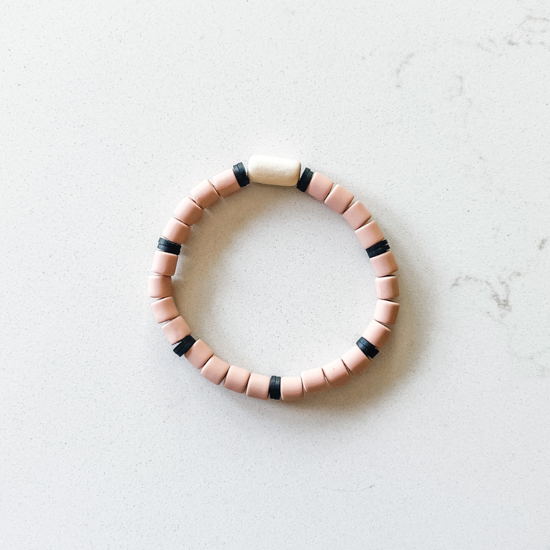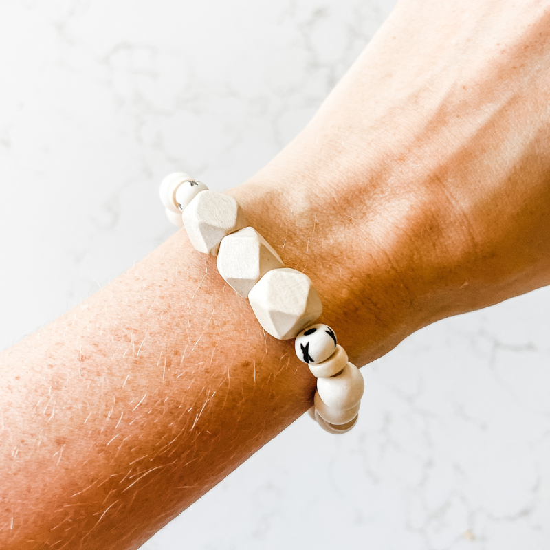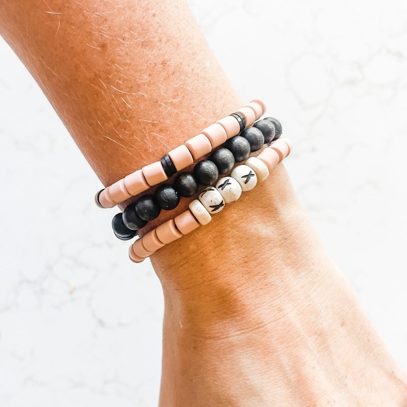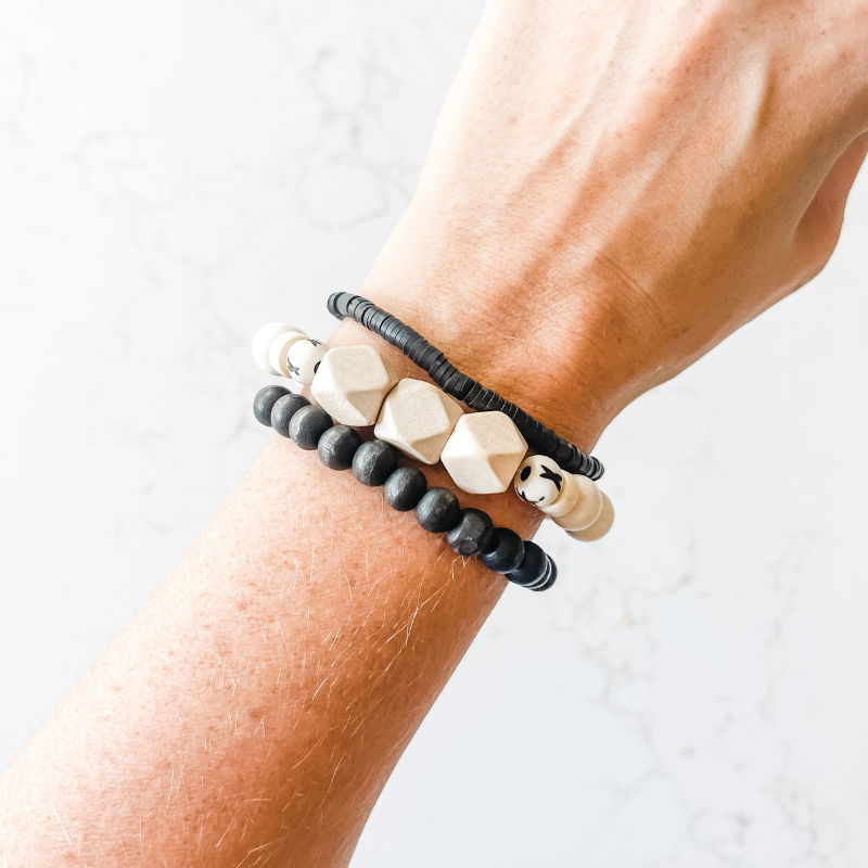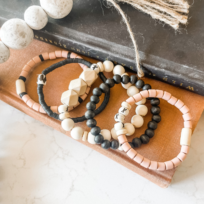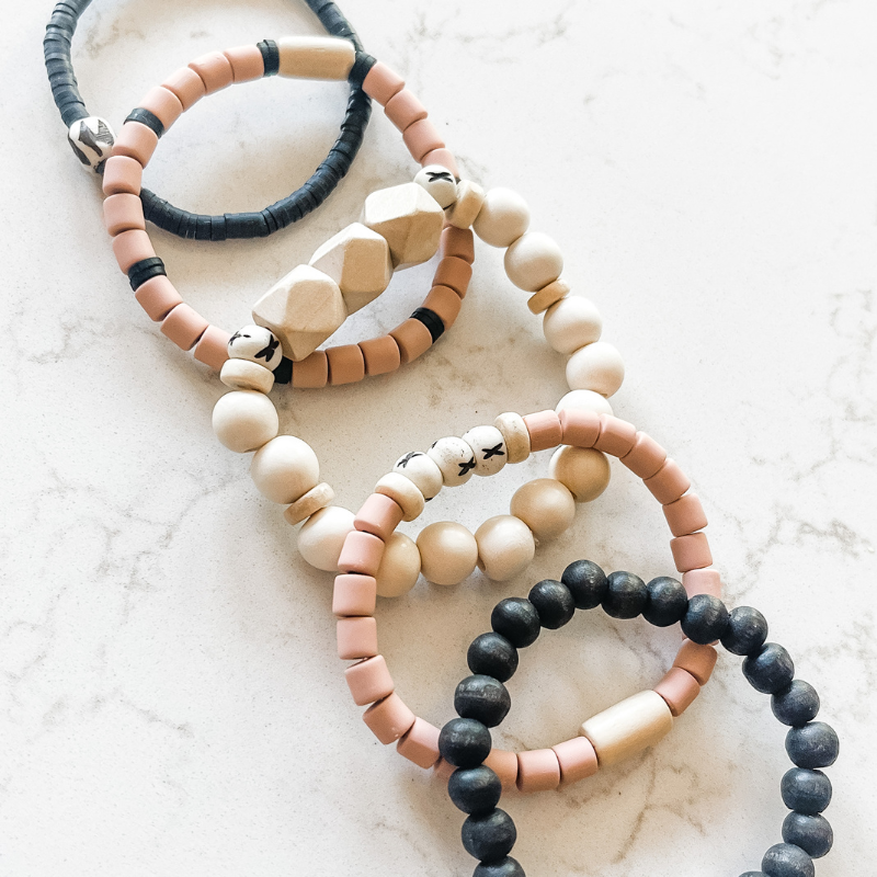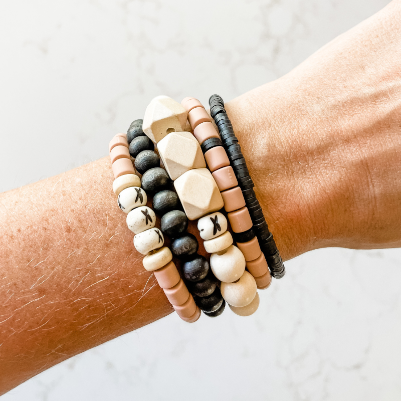 The Barista 'Grande" features five coordinating bracelets made of natural wood, rosewood, carved bone, cylinder clay and small heishi beads.