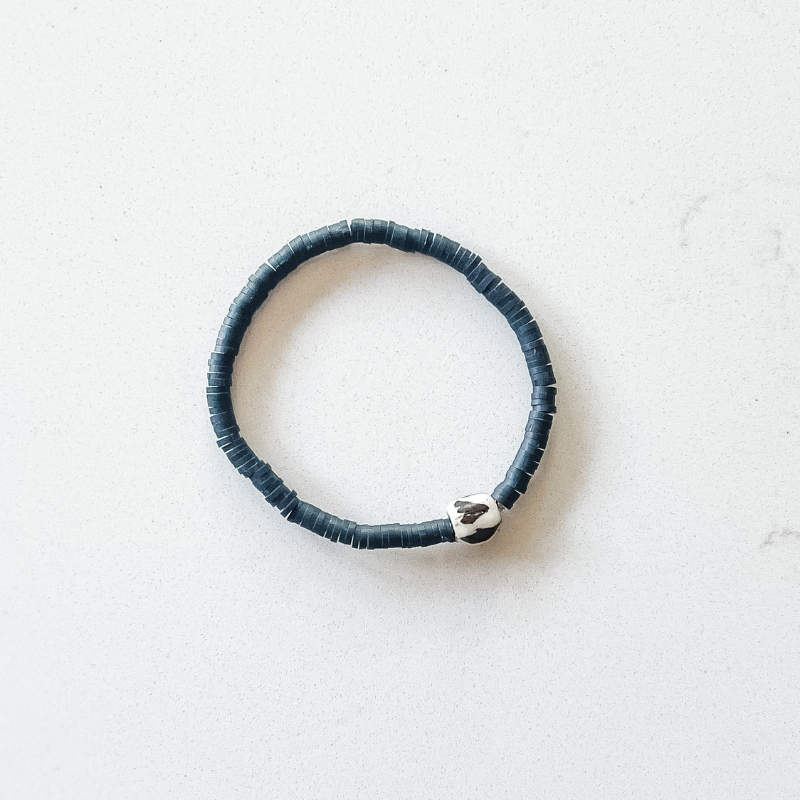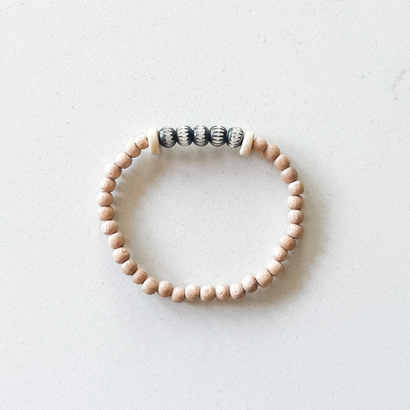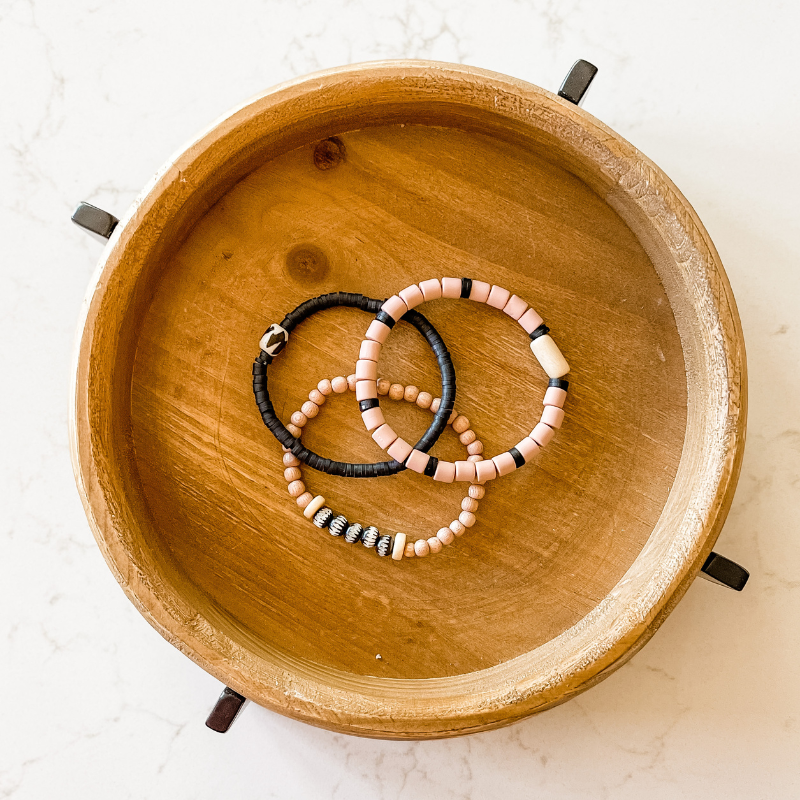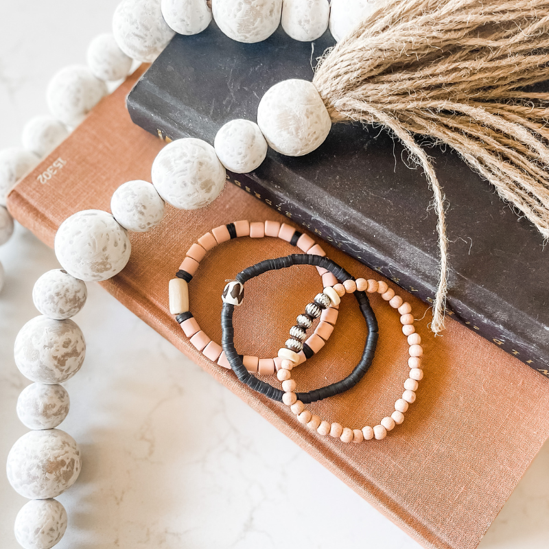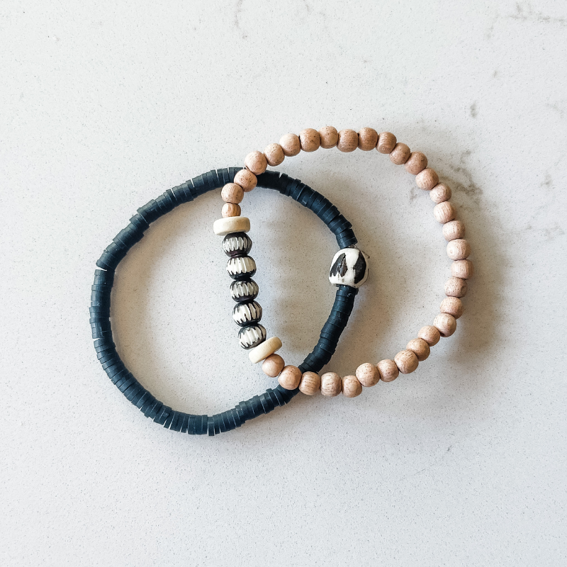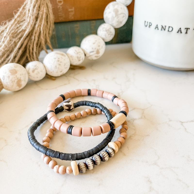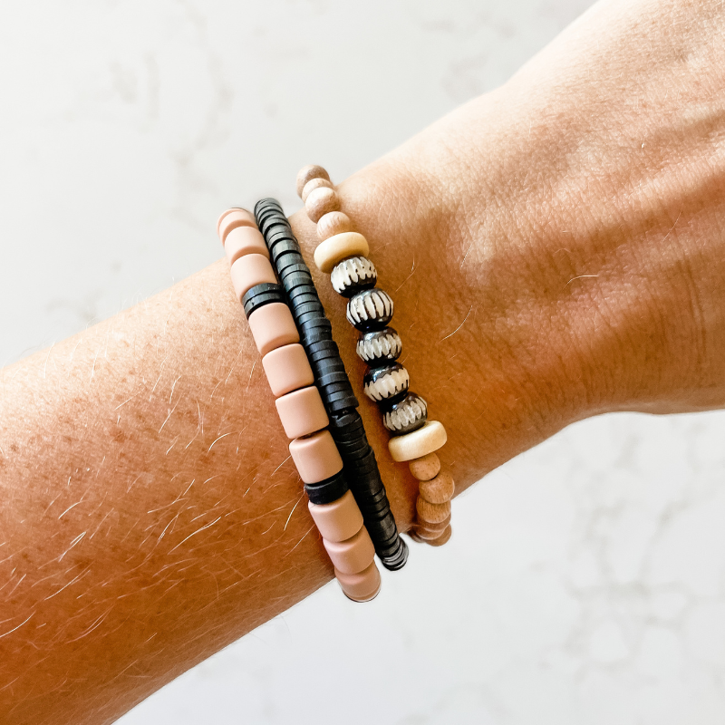 The Barista 'Tall' features three coordinating bracelets made of natural rosewood, carved chevron bone, cylinder clay and small heishi beads.