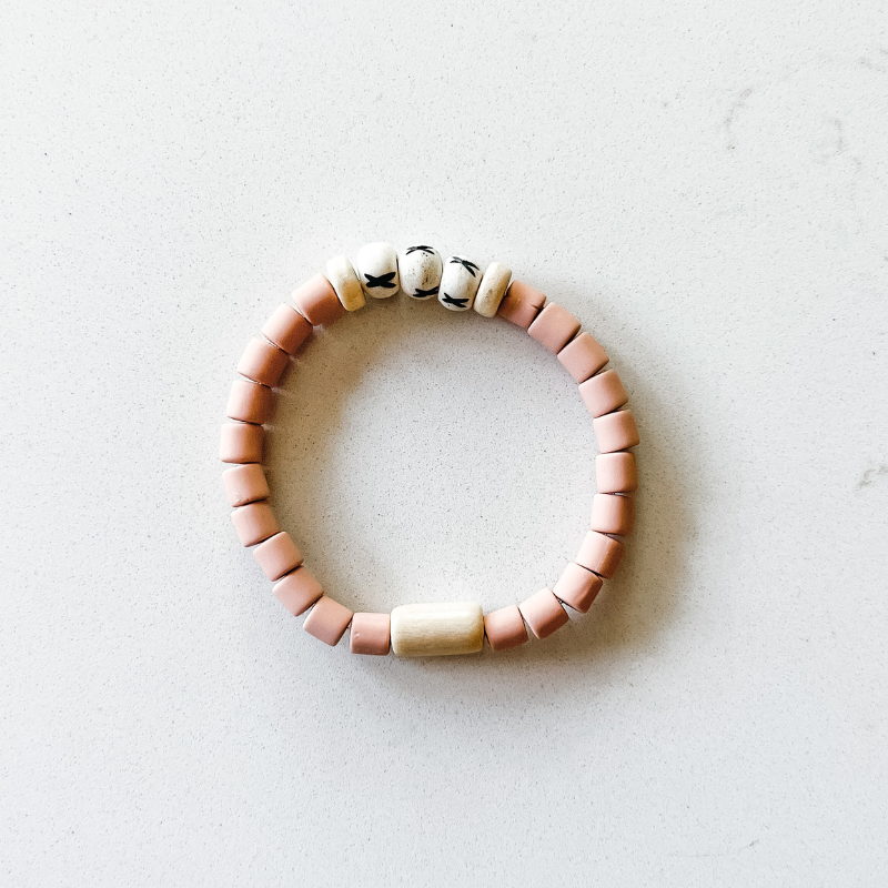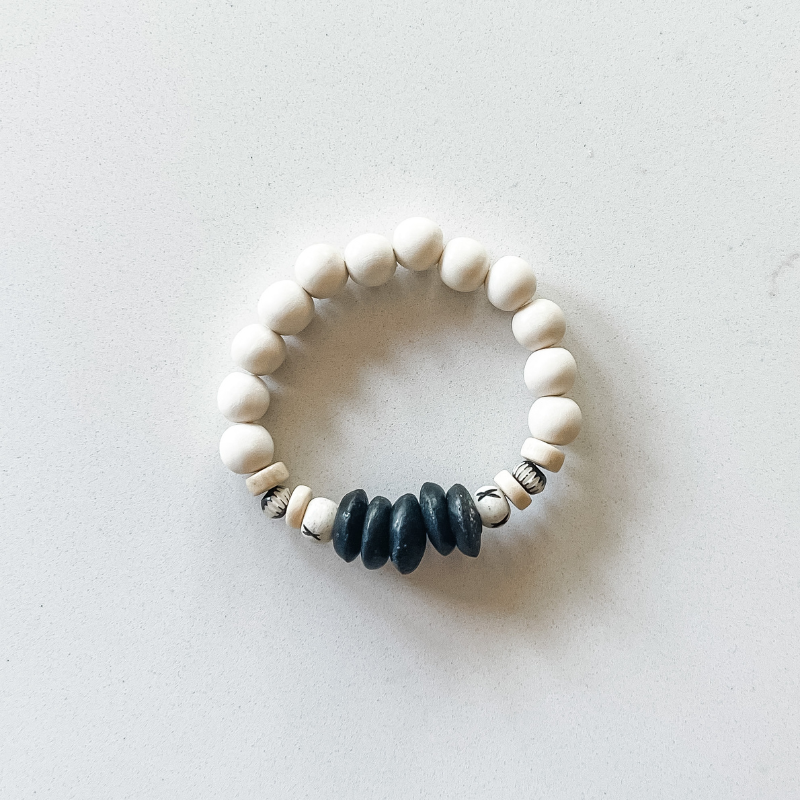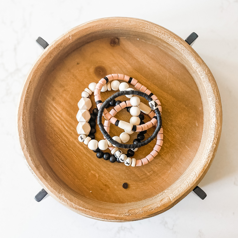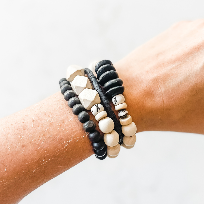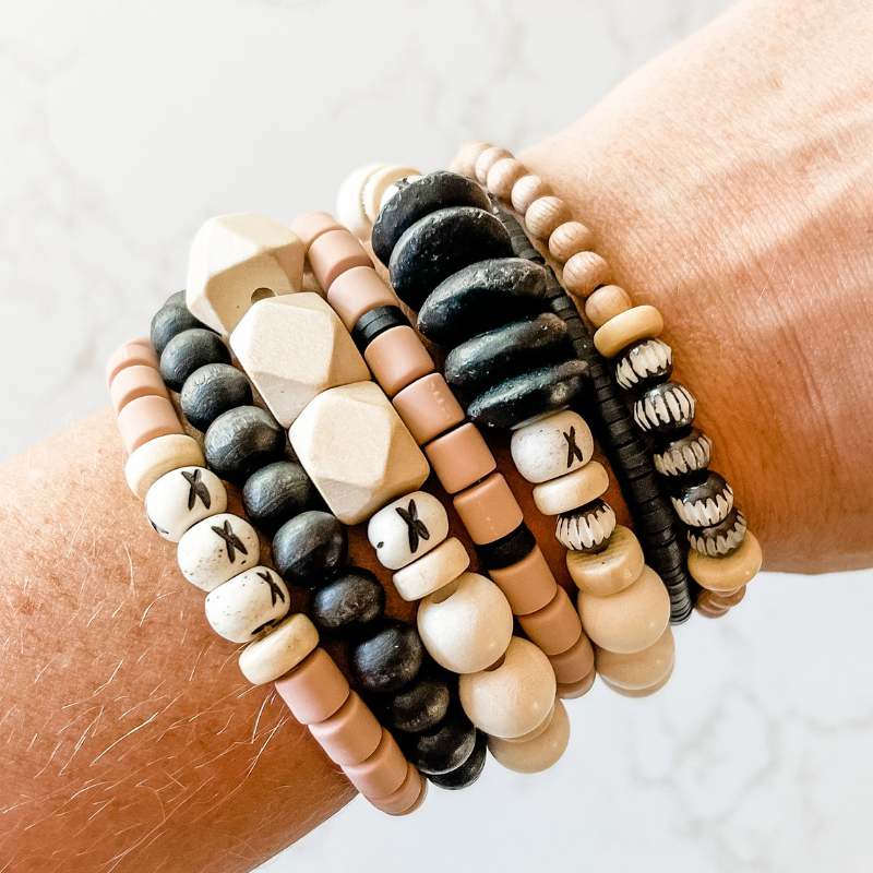 The Barista 'Venti" features seven coordinating bracelets made of natural wood, carved chevron bone, ashanti glass, rosewood, cylinder clay and small heishi beads. This super stack has so many different options the possibilities are endless! Wear 2, 4 or all 7, combine them with your favorite bangles, or wear them solo - the choice is yours!