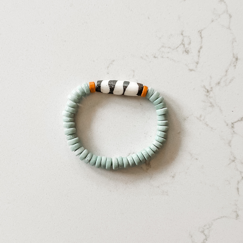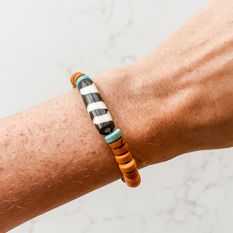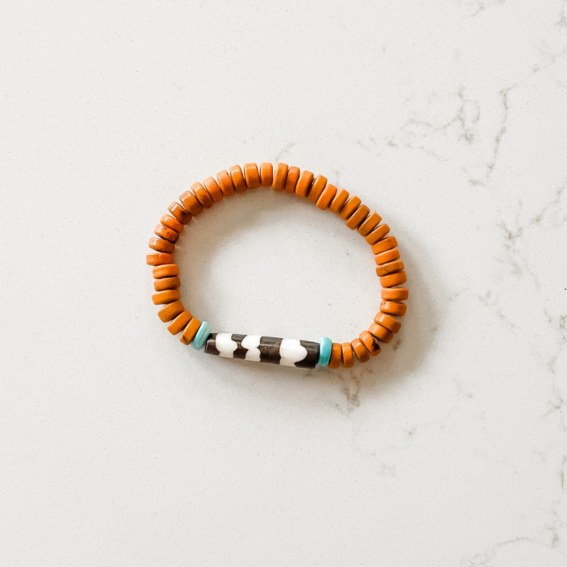 Add a touch of cowgirl flair to any outfit with the Durango. This unique statement piece is handcrafted with glass button beads, elongated bone beads, and antique brass accents. Funky and colorful, the Durango is sure to turn heads.