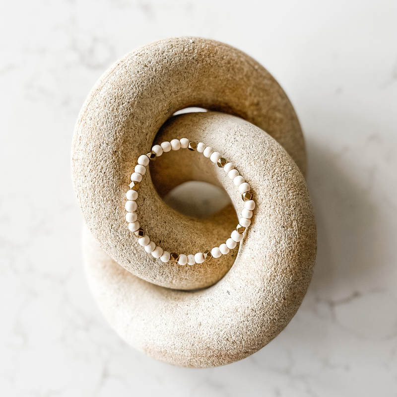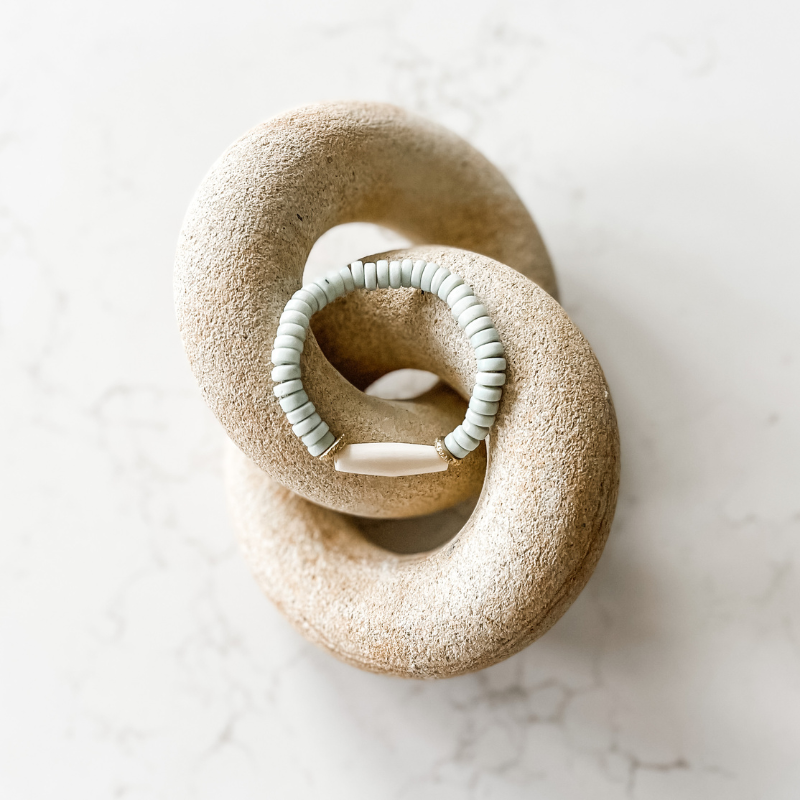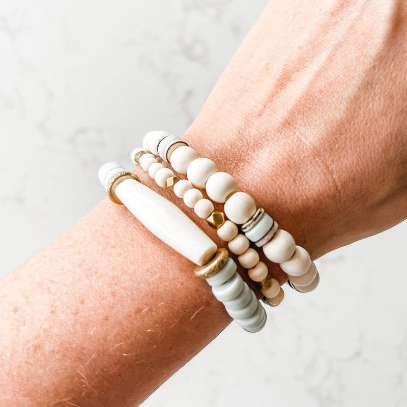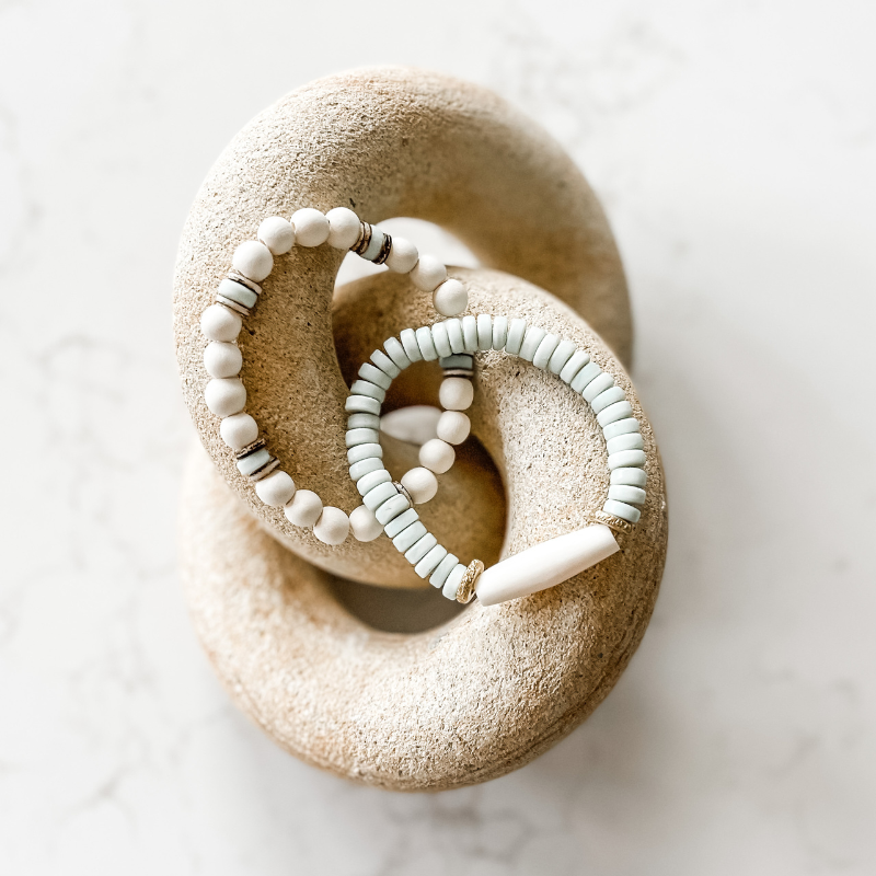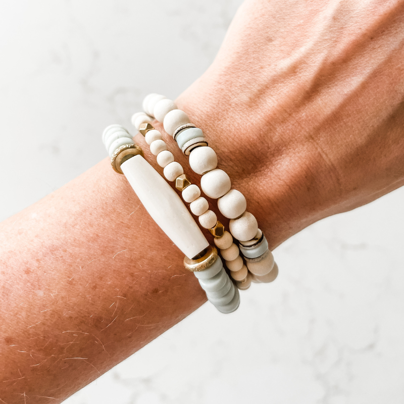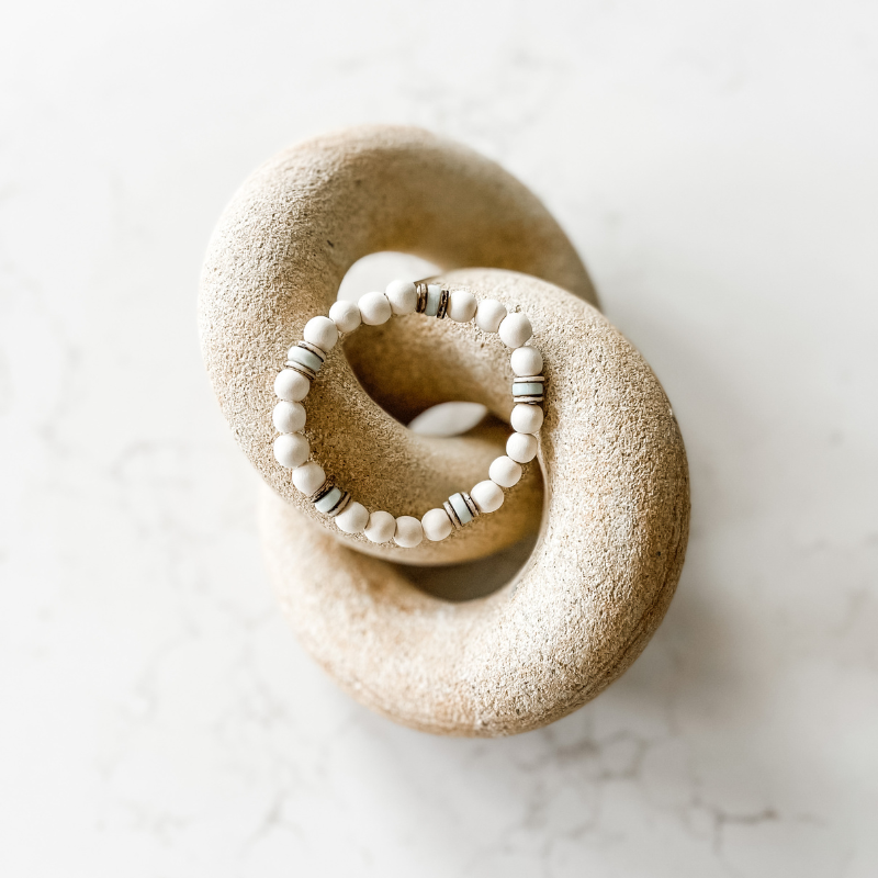 Waves on Waves is a triple stack of calming turquoise bone button beads, antique brass accents, and white wooden natural beads. This stack is the perfect way to catch a beachy vibe at any time of the year and can be worn all together or separated out in a variety of different ways!