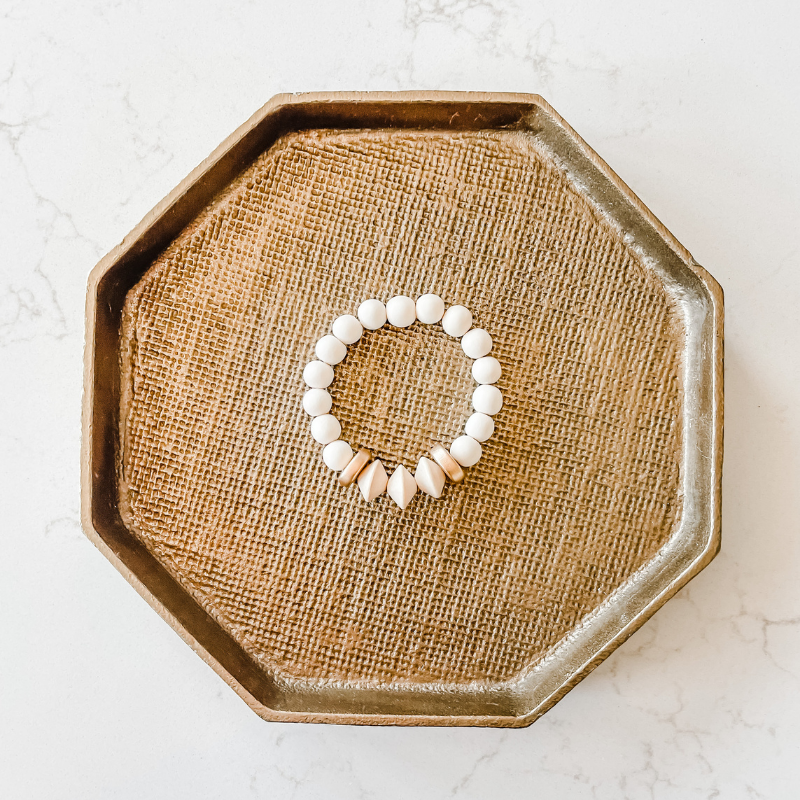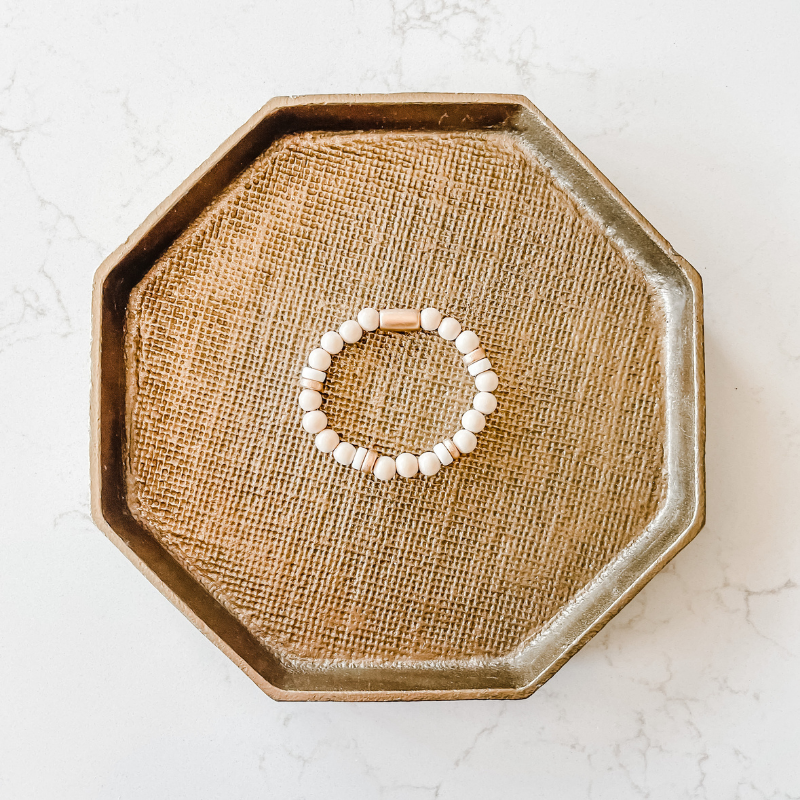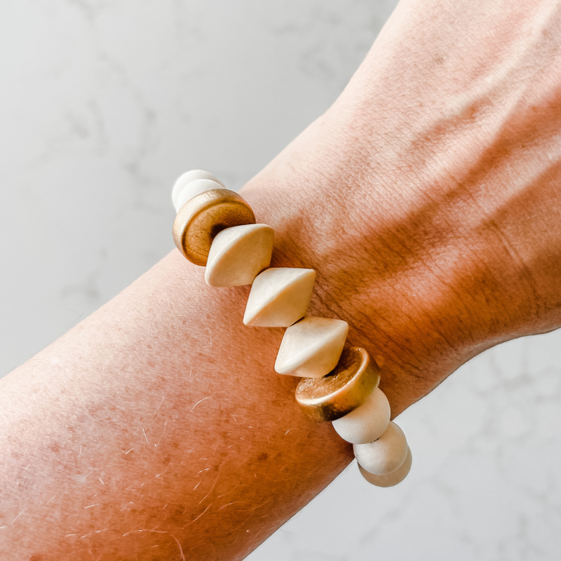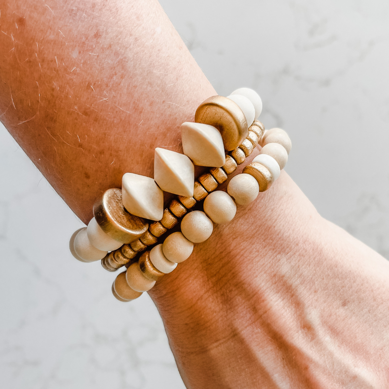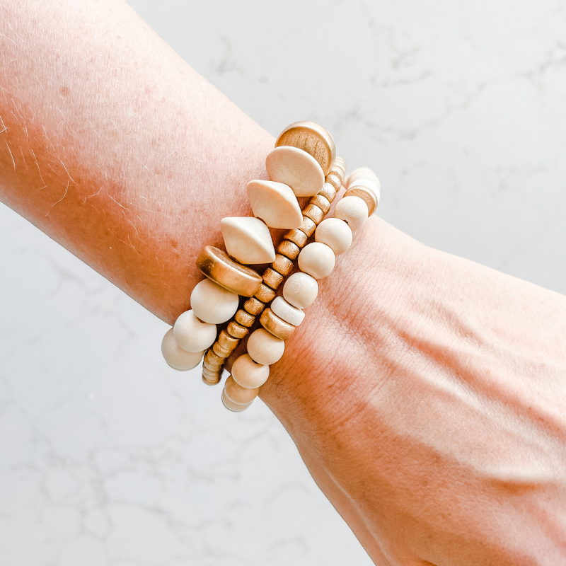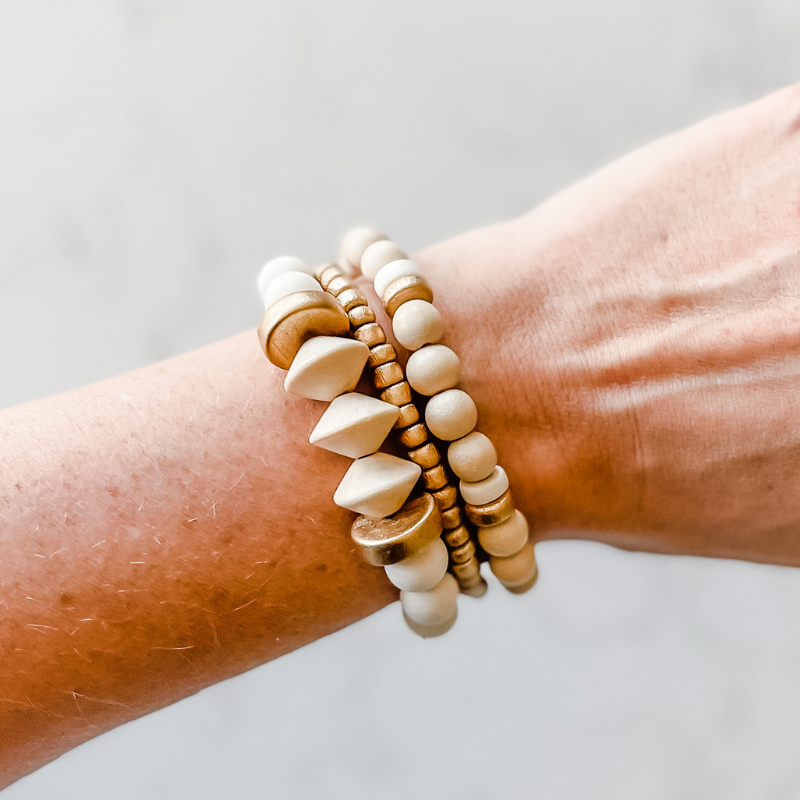 This neutral stack of three pairs perfectly with just about anything in your wardrobe. With a classic combination of white, tan and gold natural wooden beads you will instantly be transported to a relaxing day on your favorite white sand beach!